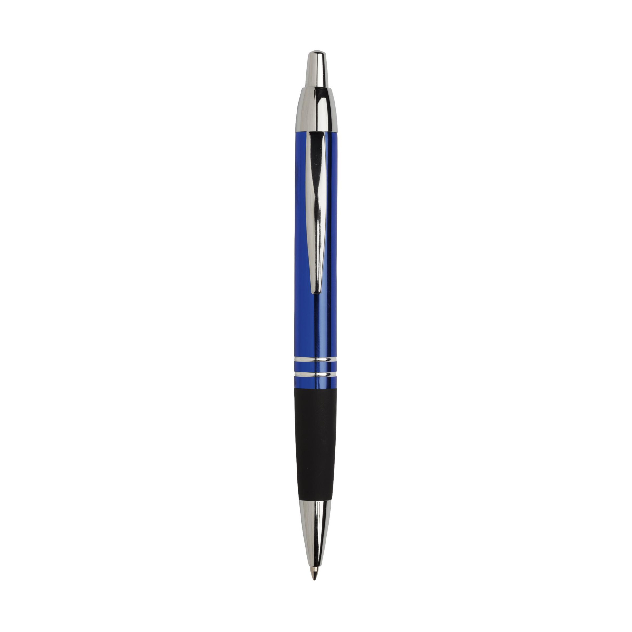 Sinisellä musteella varustettu metallinen kuulakärkikynä, jossa on kiiltävä metallinen ulkonäkö, kumikahva, tukeva metalliklipsi, painonappi ja hopeanväriset kiiltävät aksentit.
