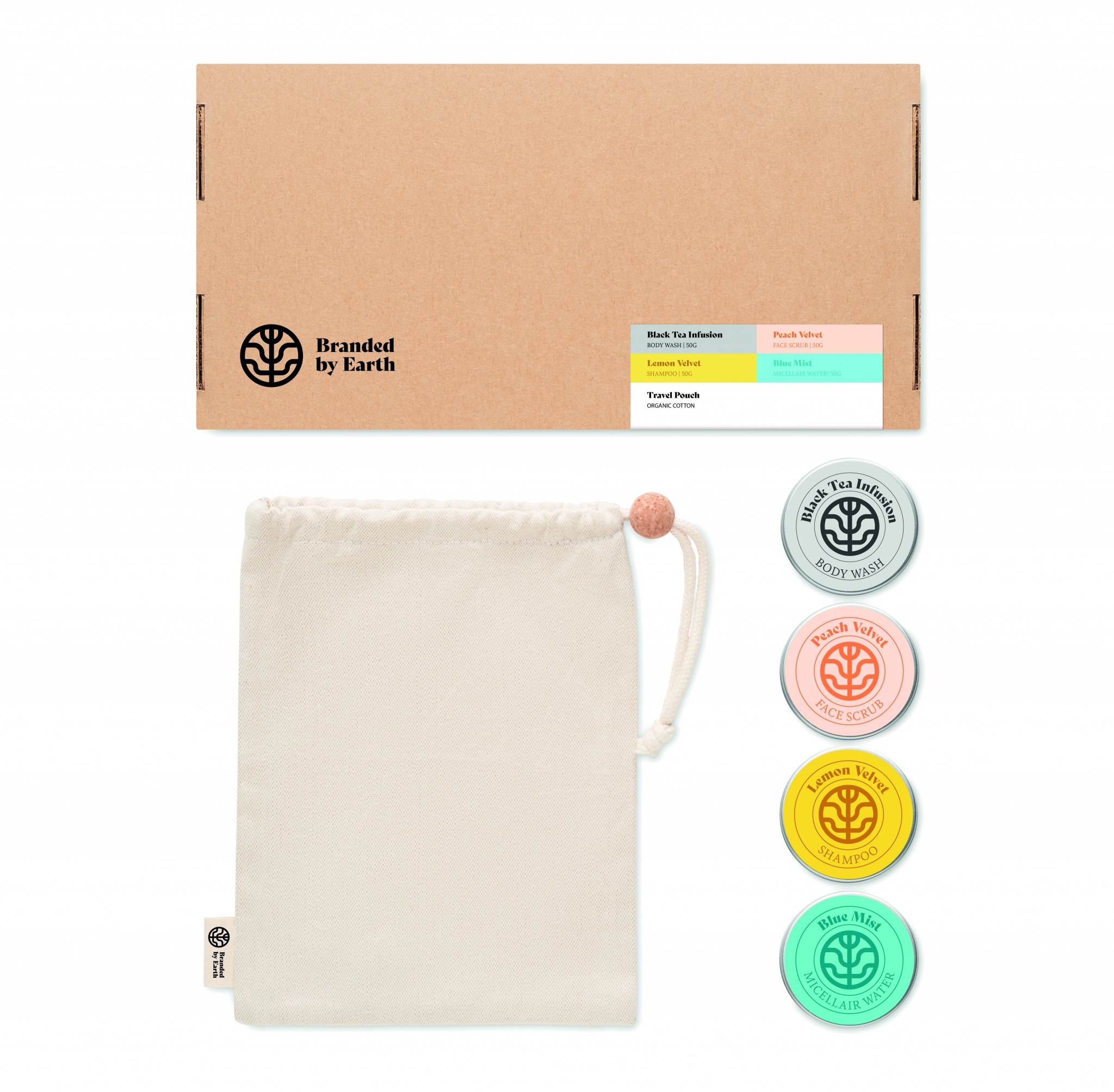 Brandet by earth hoitosetti, sisältää vegaanisen 50gr vartalonpesuaineen, shampoon, kasvojen kuorinnan, kasvoveden ja orgaanisen puuvilla matkapussin. Pakattuna pahviseen laatikkoon, valmistusmaa EU.