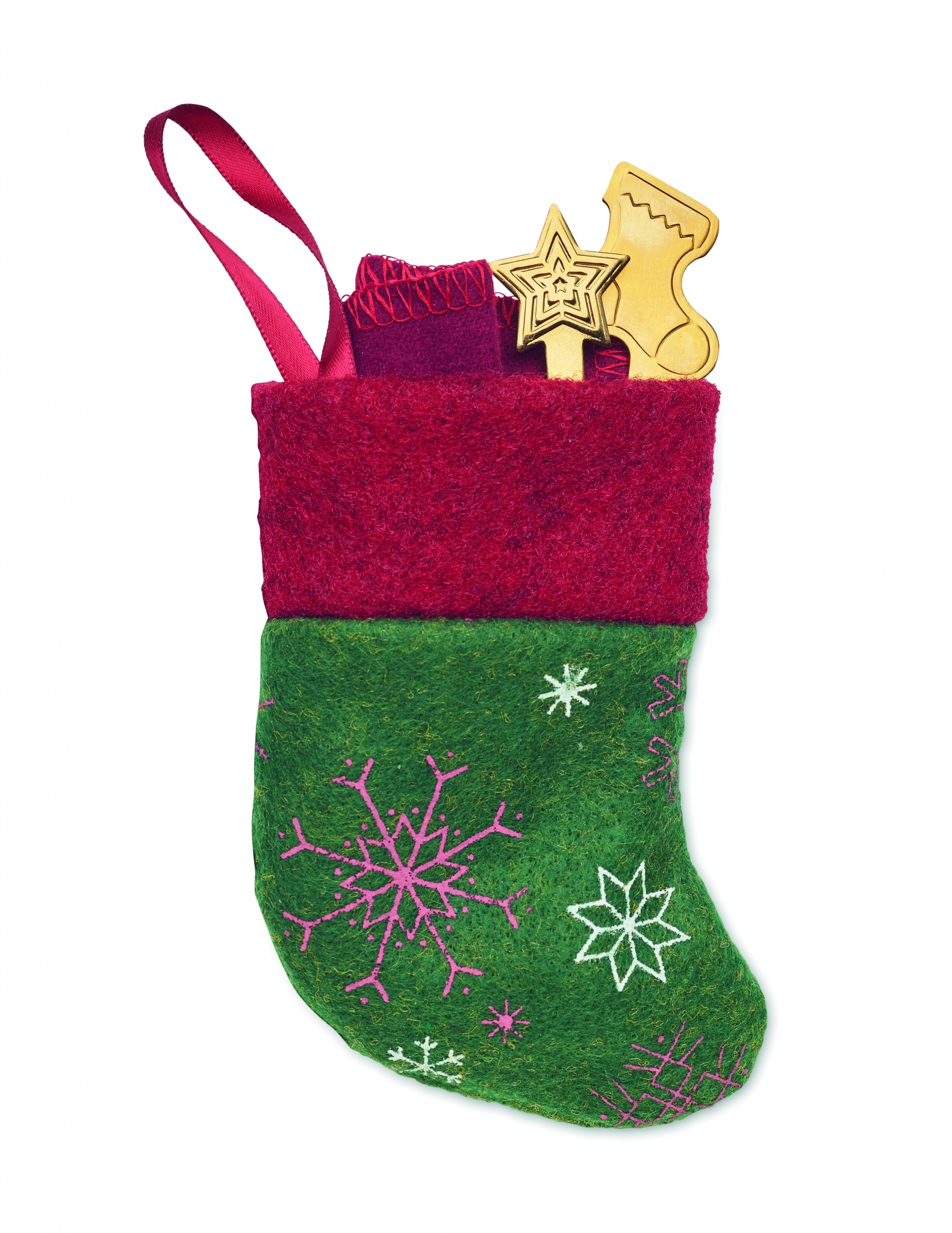 Jouluinen jälkiruokaruokailuvälinesetti, joka sisältää lusikan ja haarukan ruostumattomasta teräksestä ja 150 gr/m² puuvillalautasliinan. Toimitetaan huopasukan muotoisessa pussissa.