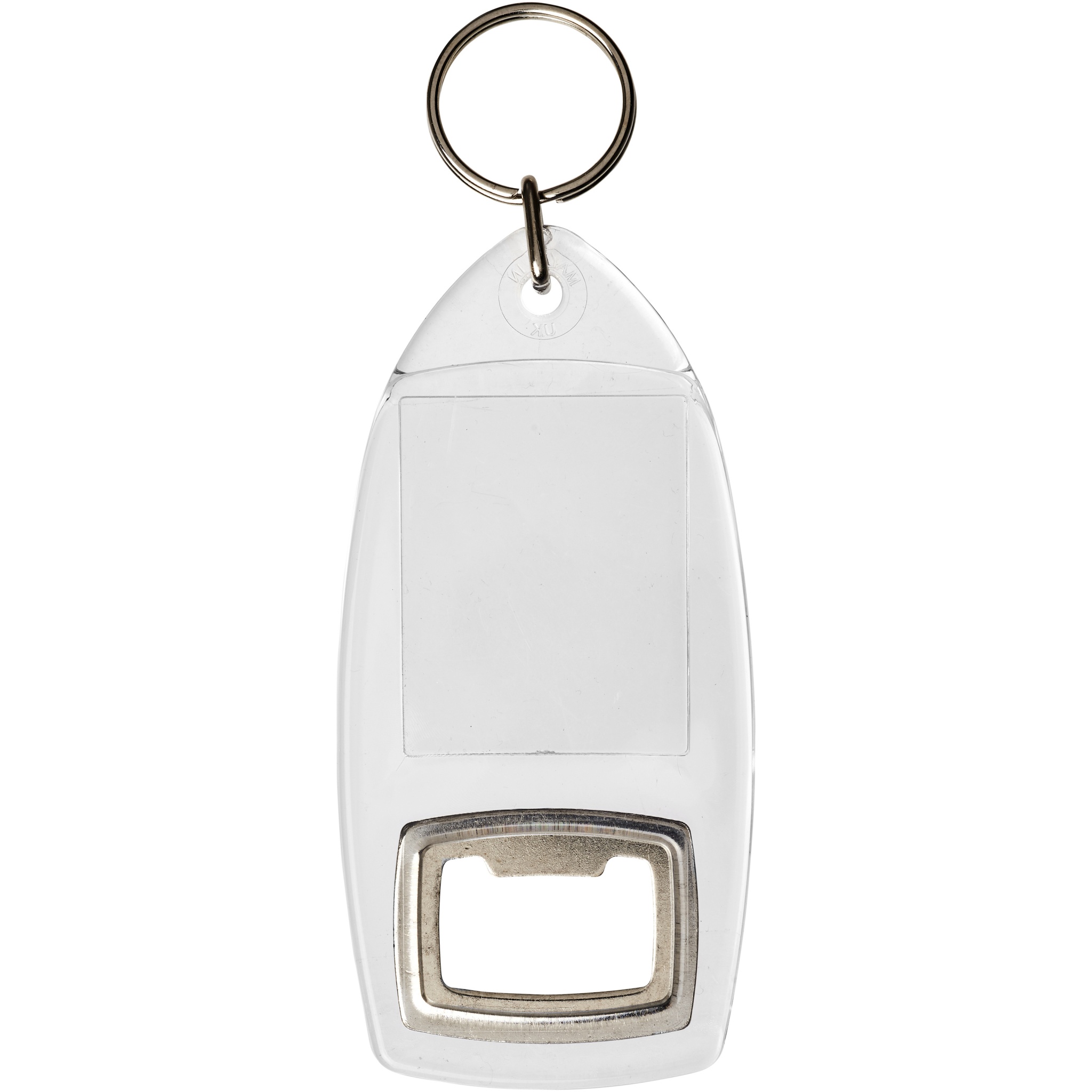 Kirkas R1-avaimenperä, jossa on pullonavaaja ja metallinen avainrengas. Metallirengas tekee profiilista litteän, mikä on ihanteellista postituksen kannalta. Tulosteinsertin mitat: 4,0 cm x 3,2 cm.
