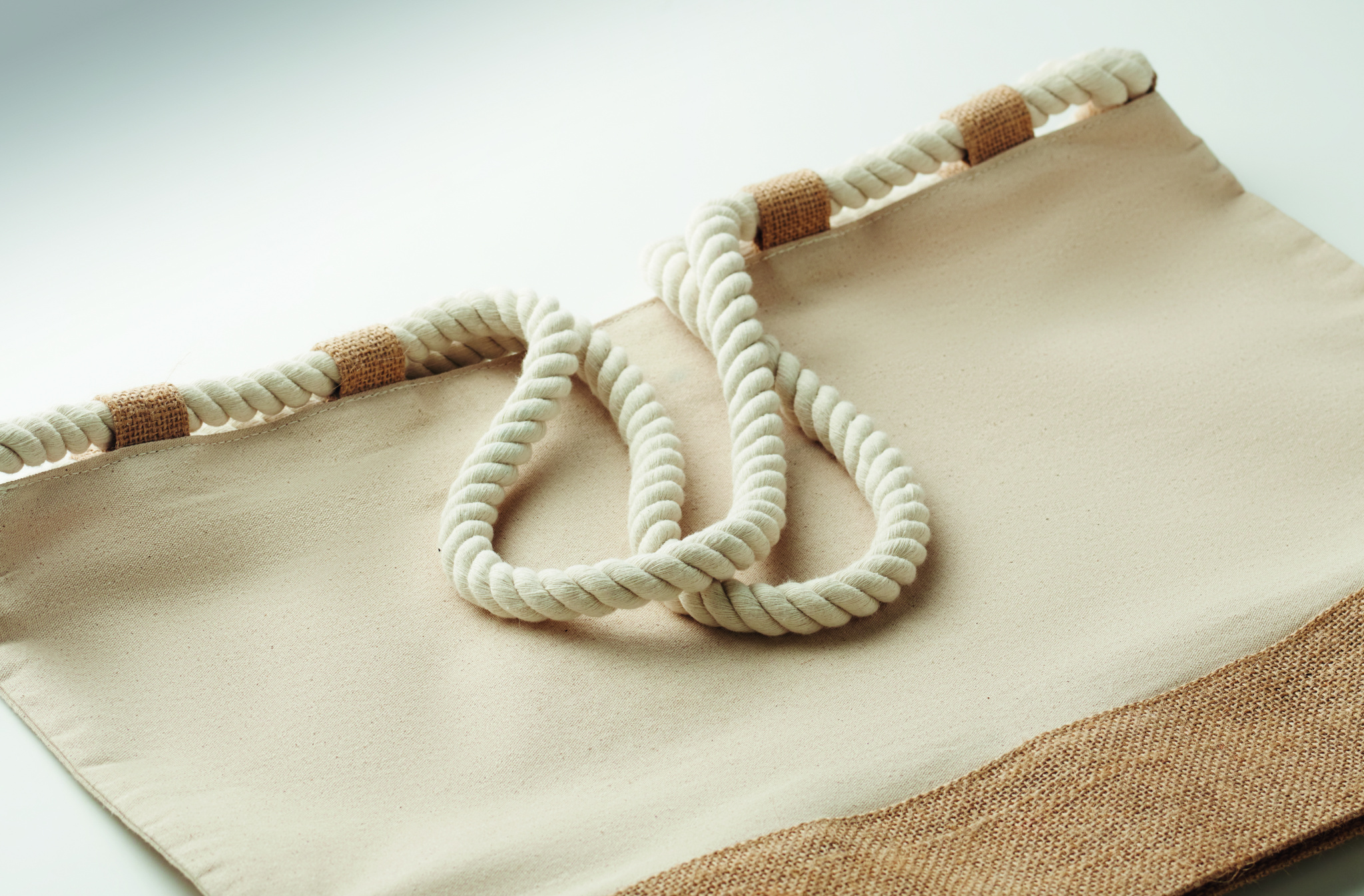 Rantakassi 280 g/m² puuvillakankaasta ja juutista, jossa nyörikahvat. Vetoketjukiinnitys, juutilla päällystetty pohja ja 10 juuttilenkkiä.