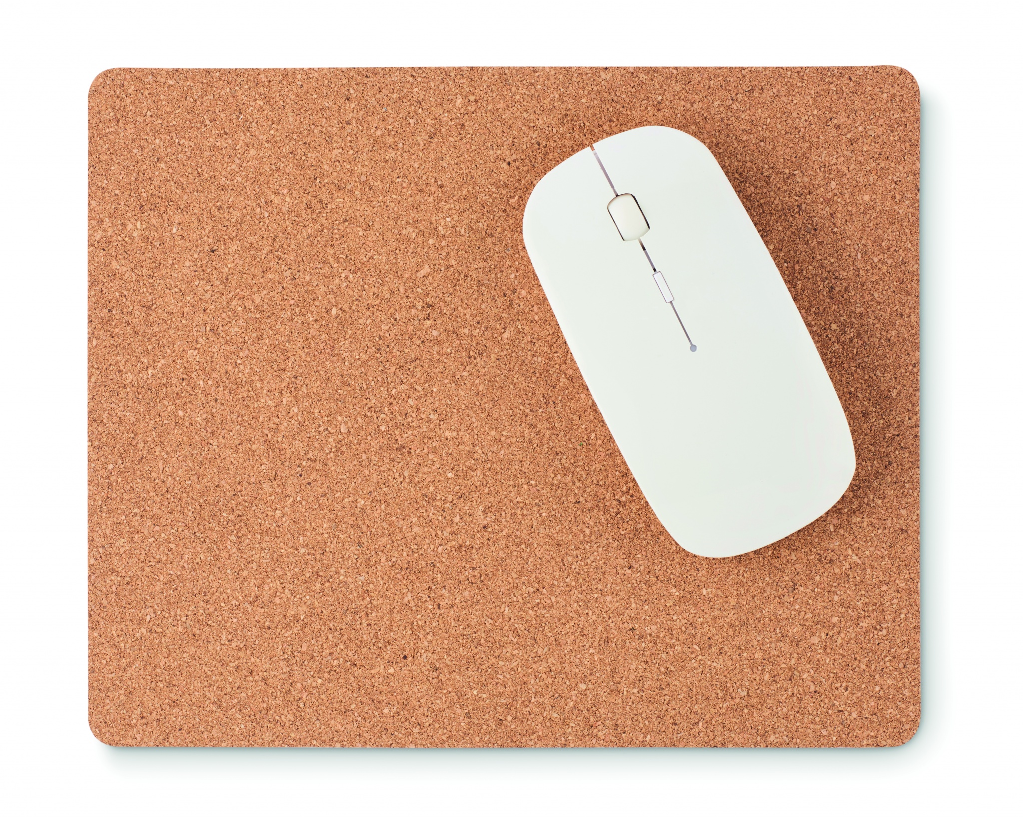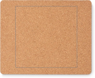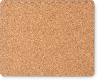 Korkista valmistettu hiirimatto. Korkki on luonnonmateriaali, strukturaalinen laatu ja pinnan huokoisuus voi aiheuttaa eroavaisuuksia tuotteissa painatuksen jälkeen