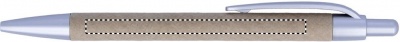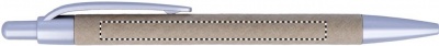 Painomekanismilla toimiva kuulakärkikynä sinisellä musteella ja kartonkirungolla. Kärki ja klipsi ABS-muovia.