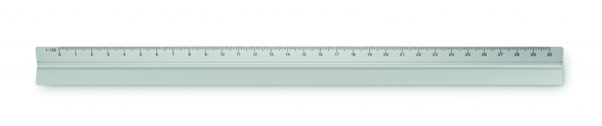 Kolmionmuotoinen mittasuhdeviivain, kolmella sivulla yhteensä viisi eri mitta-asteikkoa: 1:20/1:25/1:50/1:75/1:100. Materiaali alumiini.