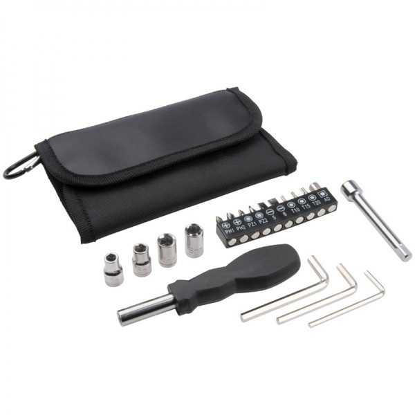 Työkalusarja koostuu ruuvimeisselistä erilaisilla muttereilla ja kärjillä, jatkokappaleesta ja kolmesta erikokoisesta kuusikulmaisesta avaimesta sekä käytännöllisestä taskusta, jossa on kiinnityskoukut, johon painamme logosi. Setti on pakattu yksittäin polybagiin.