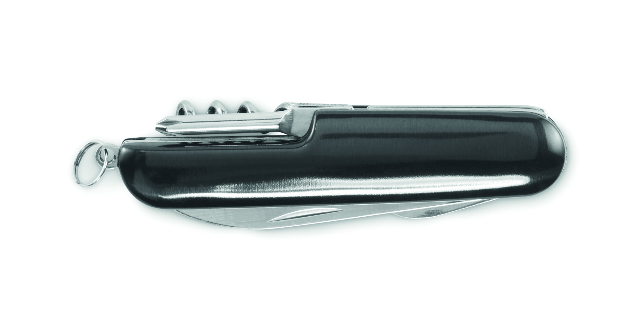 Kierrätetystä alumiinista monitoiminen taskuveitsi. 5 toimintoa: iso terä, pullonavaaja, ruuvimeisseli, korkkiruuvi ja tölkinavaaja