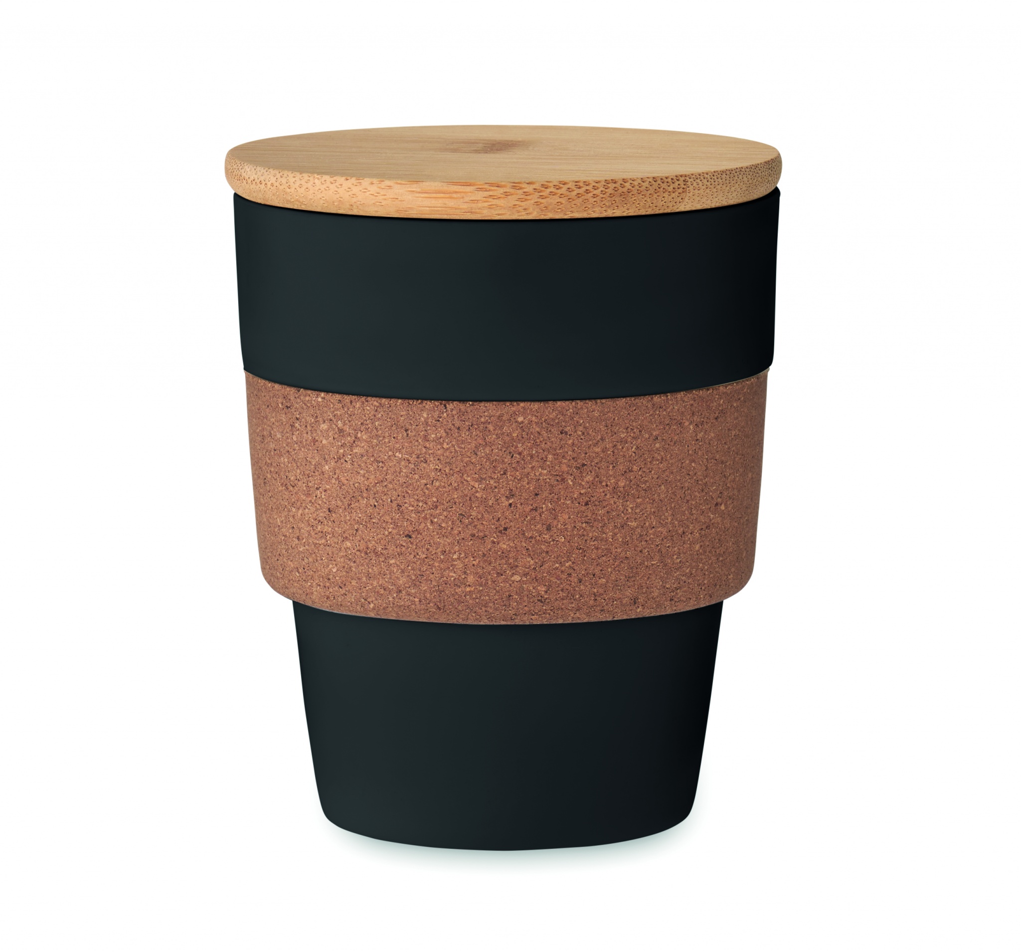 Yksiseinäinen muki kierrätetystä PP:stä, jossa korkkisuojus ja bambukansi. Tilavuus: 300 ml. Koska kyseessä on yksiseinäinen muki, lämmönsiirtymistä voi silti tapahtua.