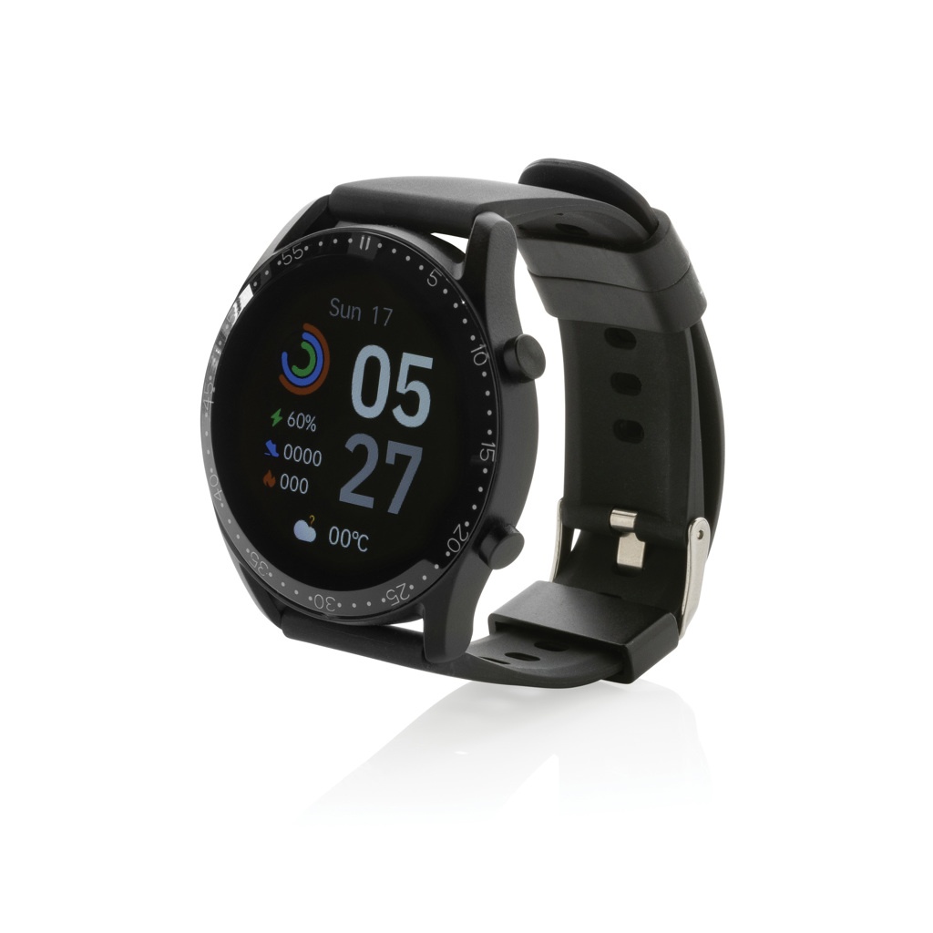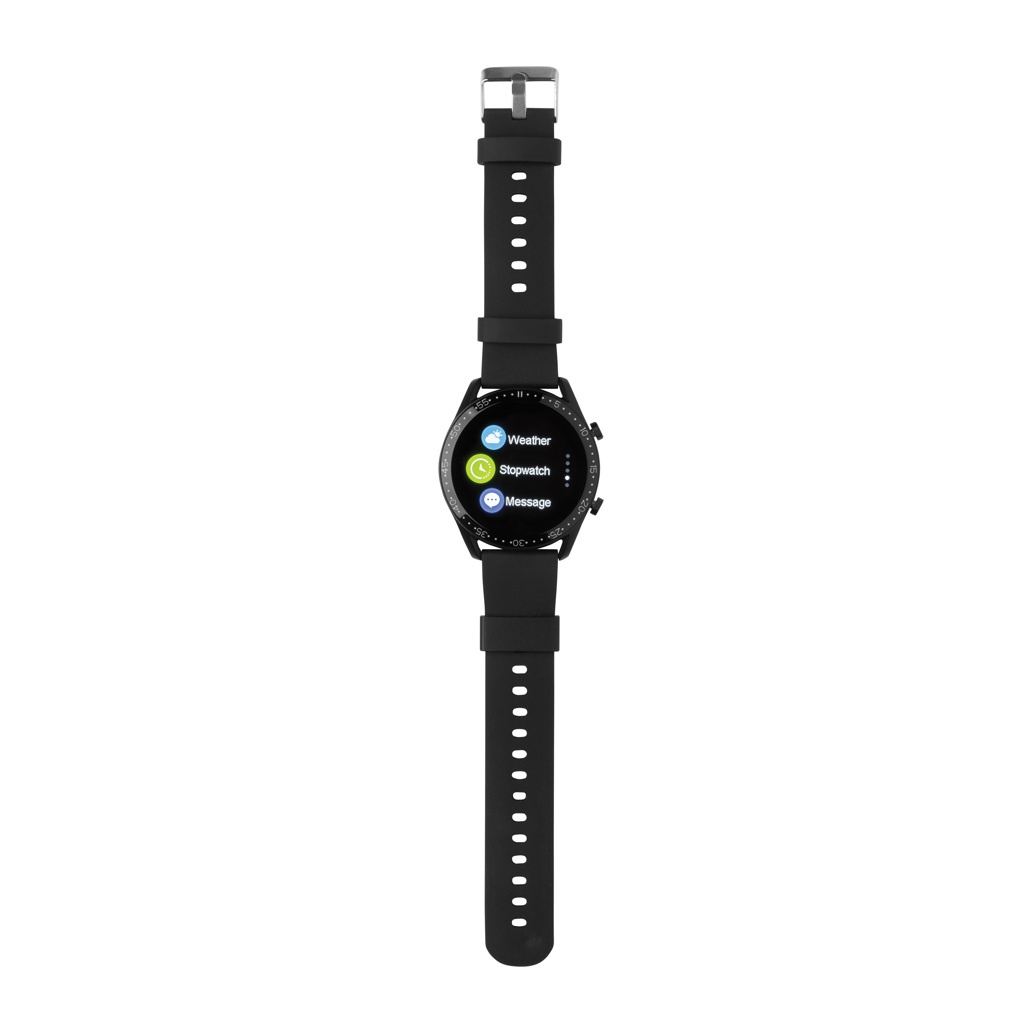 Moderni elämäntapakello 1.28" pyöreällä kosketusnäytöllä. Kellolla seuraat aktiviteettejasi koko päivän. Sisäänrakennettu mikrofoni puheluihin vastaamiseksi. Valmistettu RCS (Recycled Claim Standard) sertifioidusta kierrätetystä TPU:stä (ranneke) metallikehyksellä. Kierrätetyn materiaalin kokonaismäärä: 22% perustuen tuotteen painoon. RCS sertifiointi varmistaa kierrätettyjen materiaalien täysin sertifioidun toimitusketjun. Toimintoihin kuuluu: askelmittari, kalorit, etäisyys, multi-sport -toiminto, herätyskello, sykemittari, verenpainemittari, unimittari, kalenteri-ilmoitukset, soita ja vastaa puheluihin, ilmoitukset: viestit, Facebook, SKype, Whatsapp, Twitter etc. Sopii yhteen Android 4.4 ha iOS 8.0 ja uudempien kanssa. BT 4.0. Standby aika 15 päivää ja toiminta-aika 5 päivää. Aiaältää klippilaturin, jolla ladata kello. Pakattu FSC®-sekoituksesta valmistettuun kraft-pakkaukseen. Tuote ja lisätarvikkeet 100% PVC-vapaita.