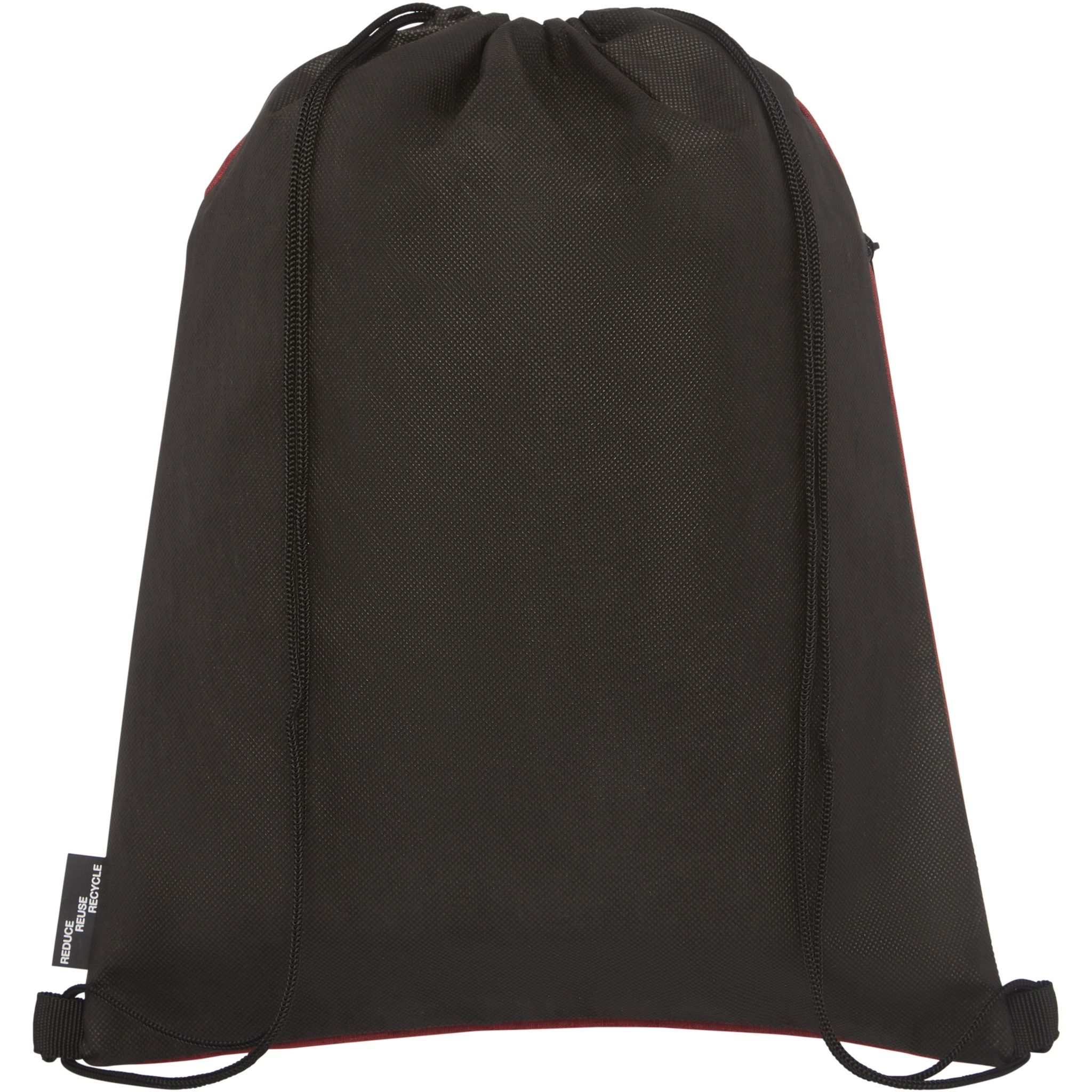 Kiristysnyörillinen musta reppu, jossa on narulla suljettava päälokero. Meleerattu sävy edessä ja takaosa musta. Vetoketjullinen etutasku. Kestää jopa 5 kg painon. Varsinaisen tuotteen väri saattaa vaihdella hieman kangasvärien, kudonnan ja painatusten vuoksi.