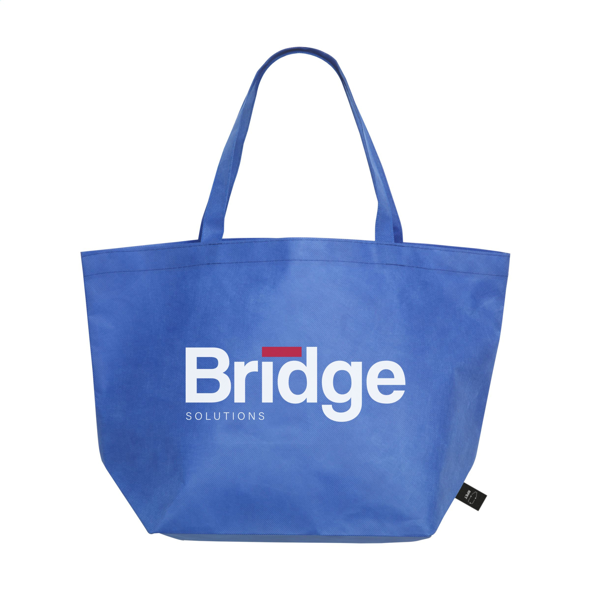 Runsas RPET-kuitukangas-ostos- ja rantakassi (80 g/m²), joka on valmistettu kierrätetyistä PET-pulloista. Leveä laukku, sekä vahva että kevyt pitkällä kahvalla. Kapasiteetti n. 25 litraa.