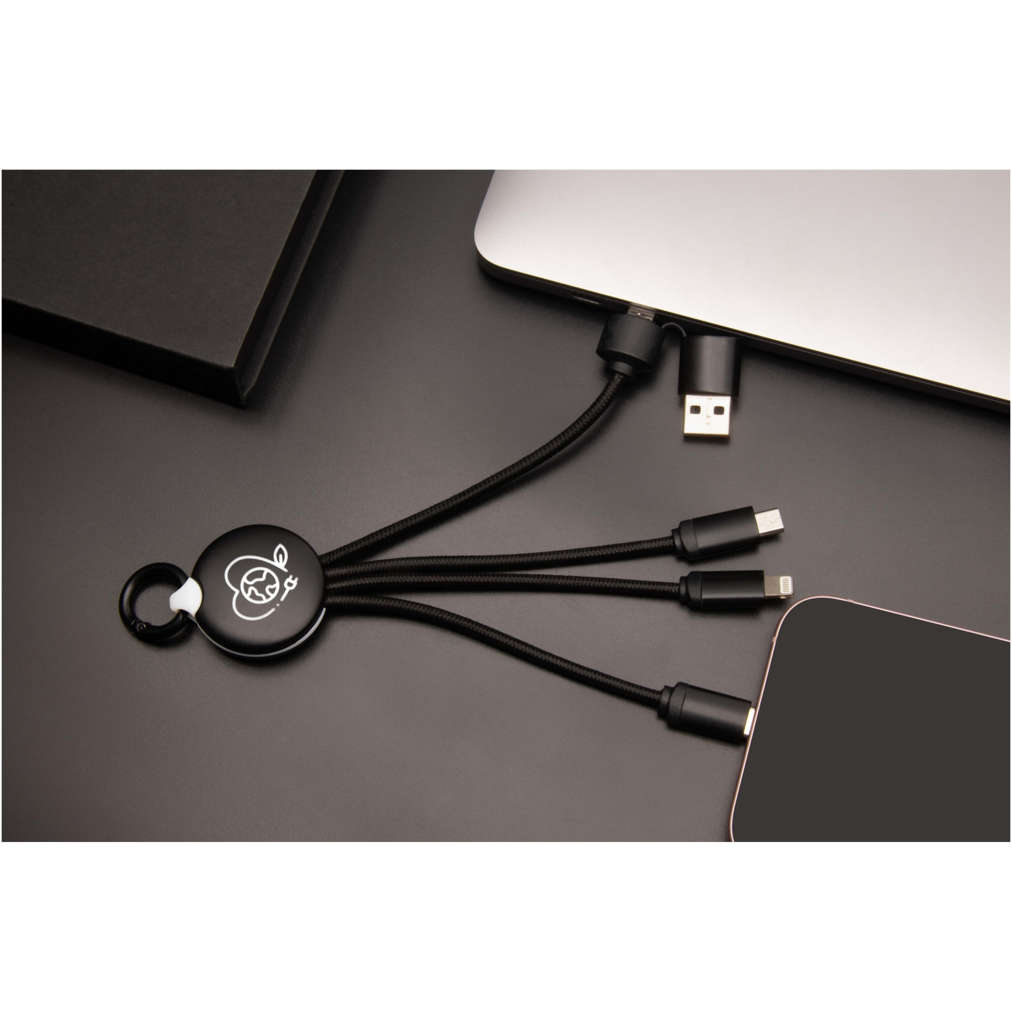 5-in-1-latauskaapeli, jossa on 3 liitintä (Type-C, Android, iPhone) ja rPET-johdot (valmistettu kierrätetyistä muovipulloista). USB-A- ja USB-C-liittimen ansiosta kaapeli on täysin yhteensopiva markkinoiden uusimpien tietokoneiden (USB-C) kanssa. Kärjissä metallia muistuttava pinta. Kaapelilla voi ladata jopa 3 laitetta samanaikaisesti. Toimitetaan kierrätettävässä rasiassa kierrätyspaperikortilla.
