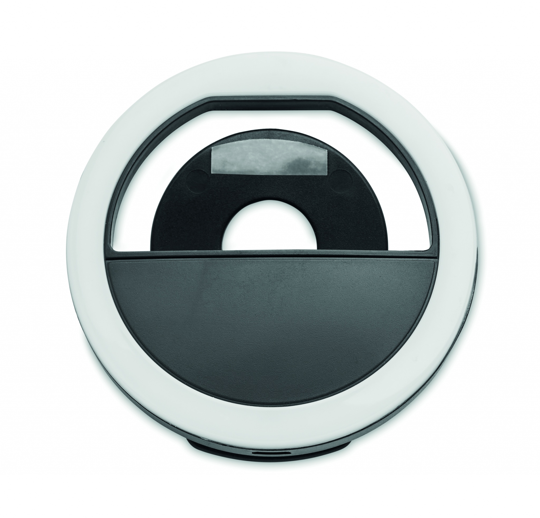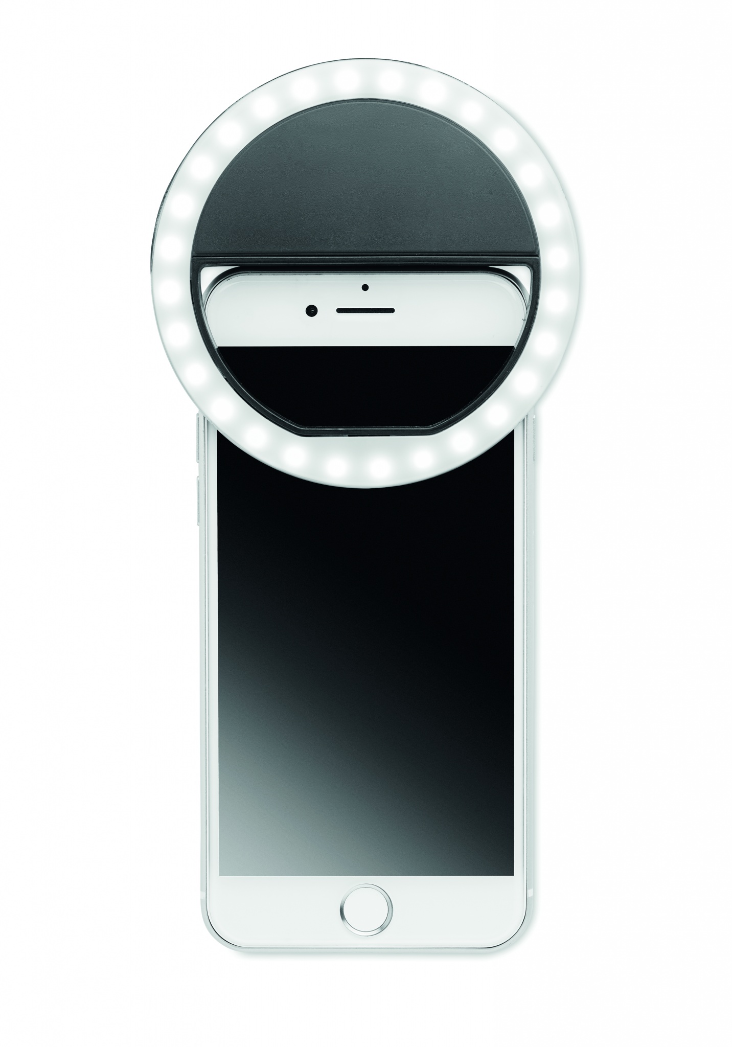 8 cm ABS kannettava selfievalo 28 LED valolla, 3 erillaista valonsäätöä. Uudelleen ladattava 80 mAh akku.