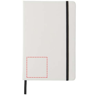 Valkoinen A5 muistikirja värillisellä joustavalla suljentanauhalla ja sivumerkillä. 80 sivua (60g/m2) viivoitettua paperia. Kansi voidaan digipainaa.