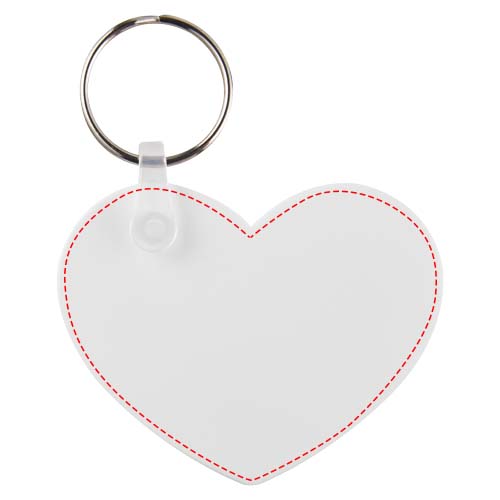 Valkoinen sydämenmuotoinen avaimenperä, jossa on metallinen avainrengas. Metallirengas tekee profiilista litteän, mikä on ihanteellista postituksen kannalta.