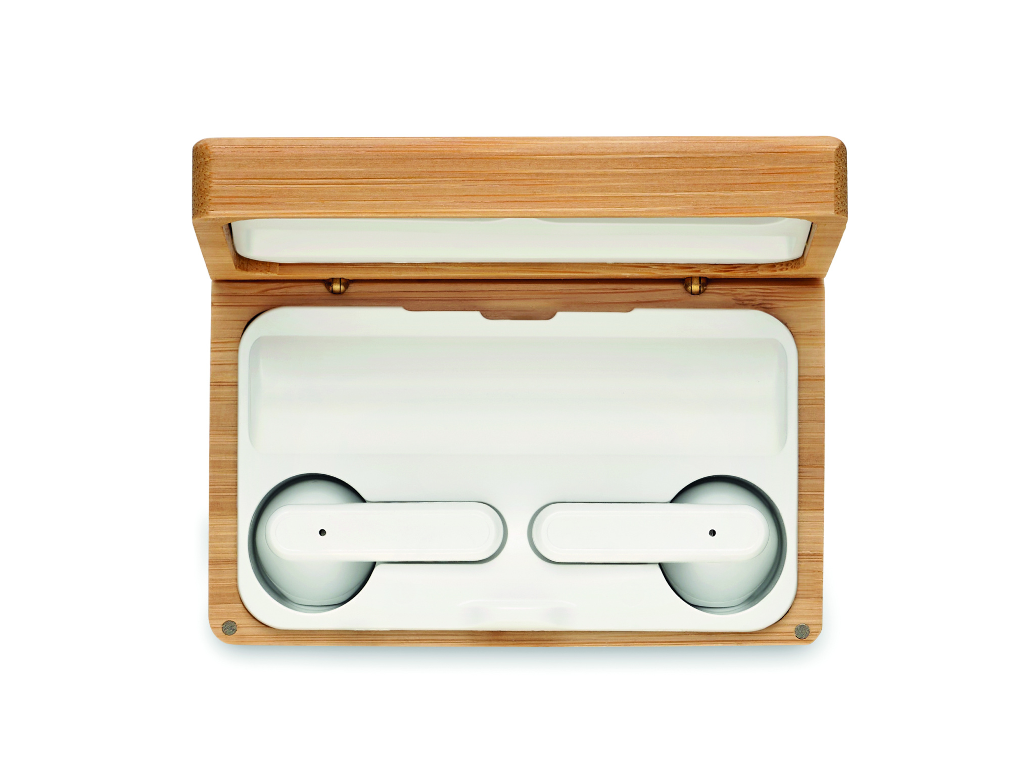 Logo trade liikelahjat mainoslahjat kuva: TWS-kuulokkeet bambukotelossa