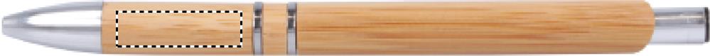 Spausdinimo rašiklis iš aliuminio jungiamųjų detalių su bambuko statine. Mėlynas rašalas. Bambukas yra natūralus produktas, gali šiek tiek skirtis kiekvieno gaminio spalva ir dydis, o tai gali turėti įtakos galutiniam dekoravimo rezultatui.