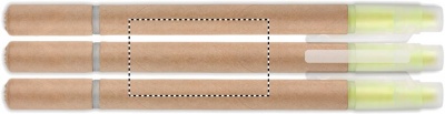 2 vienā otrreiz pārstrādāta kartona mucas lodīšu pildspalva un dzeltens marķieris. Zilā tinte.
