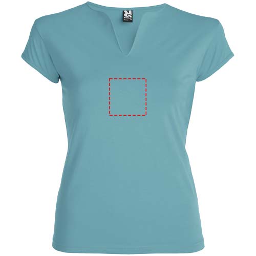 Pieguļošs T-krekls ar izgriezuma kakla izgriezumu un V veida atvērumu priekšpusē. Apgrieztas puspiedurknes un sānu vīles. Augstas kvalitātes audums mīkstam un patīkamam pieskārienam. Noņemama etiķete. Modelis ir 179 cm garš un valkā S izmēru.