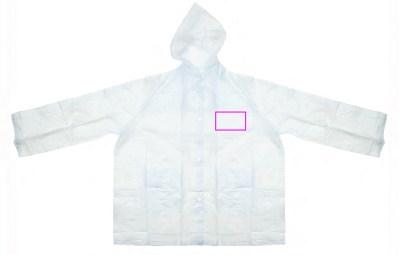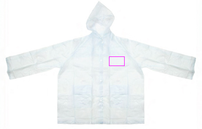 PVC lietus jaka (viens izmērs XL) caurspīdīga matēta ar kapuci, divām priekšējām kabatām un spiedpogām. Mēs uzdrukāsim jūsu logotipu uz krūtīm (sirds pusē).