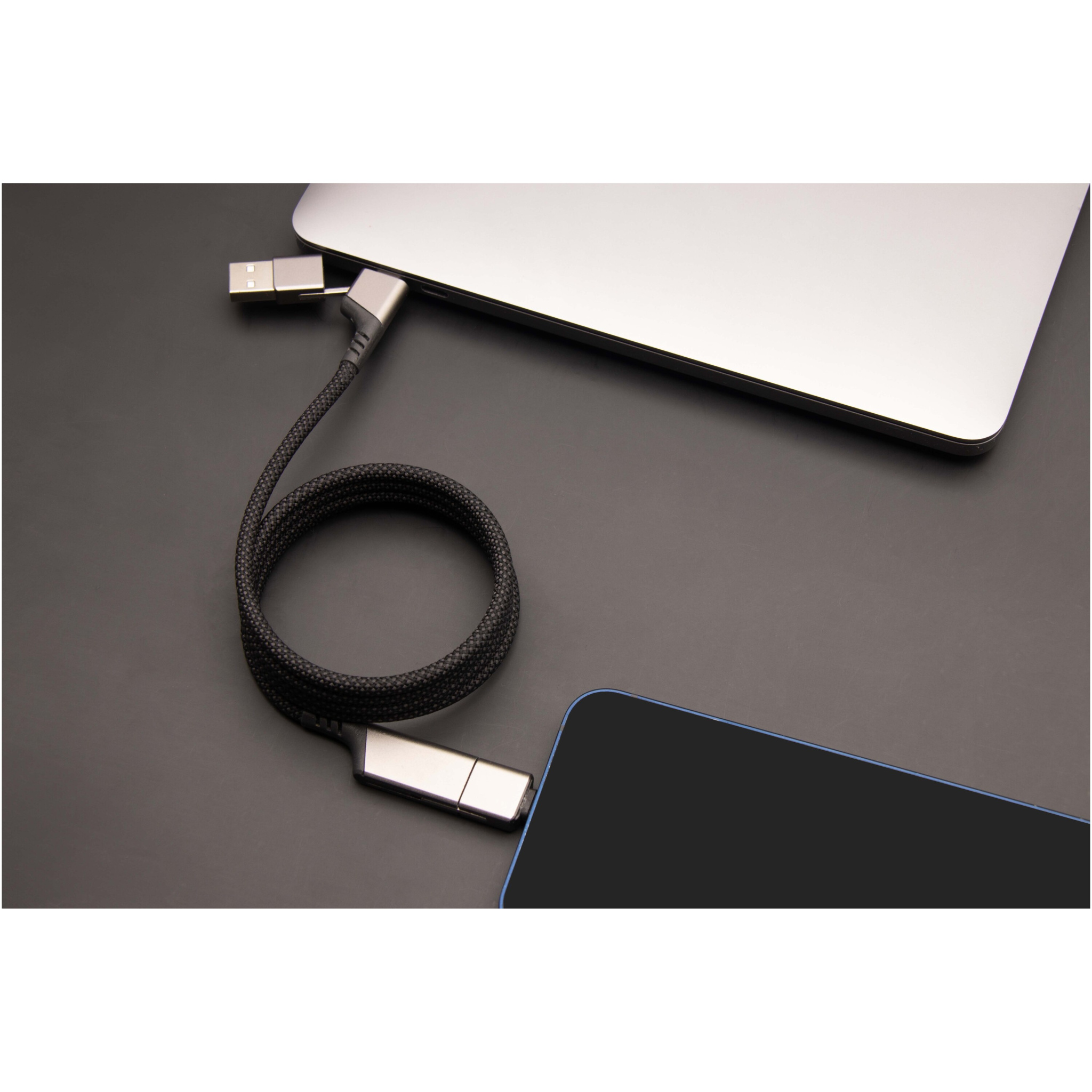 4-in-1 īpaši ātrs rPET 100 W īpaši ātrs magnētiskais uzlādes kabelis, kas var uzlādēt viedtālruņus, planšetdatorus un klēpjdatorus. Dubultā USB-A + USB-C ieeja padara kabeli 100% saderīgu ar jaunākajiem datoru modeļiem. Izvade: C tips un Lightning. Saderīgs ar CarPlay. Piegādāts ar pārstrādājamu TPU maisiņu un pārstrādāta papīra ieliktni. Kabeļa garums: 1 metrs.