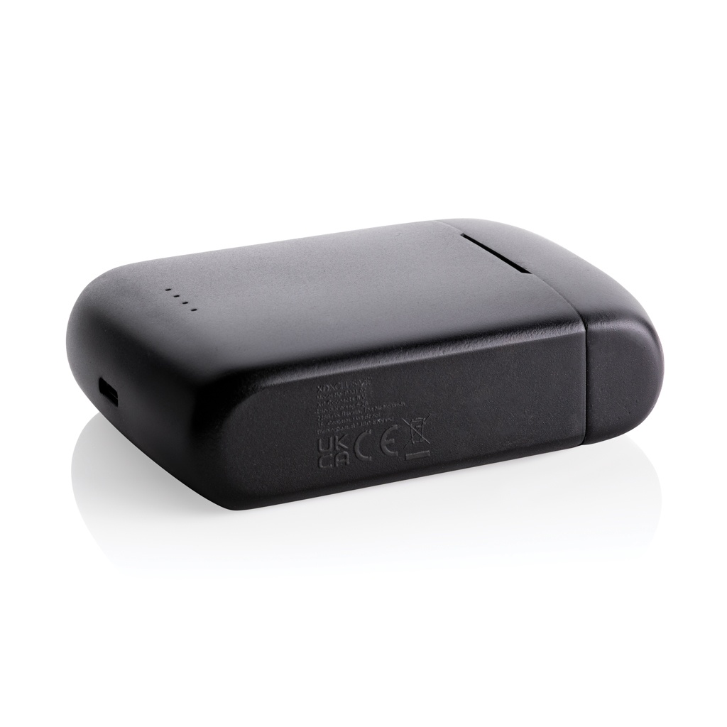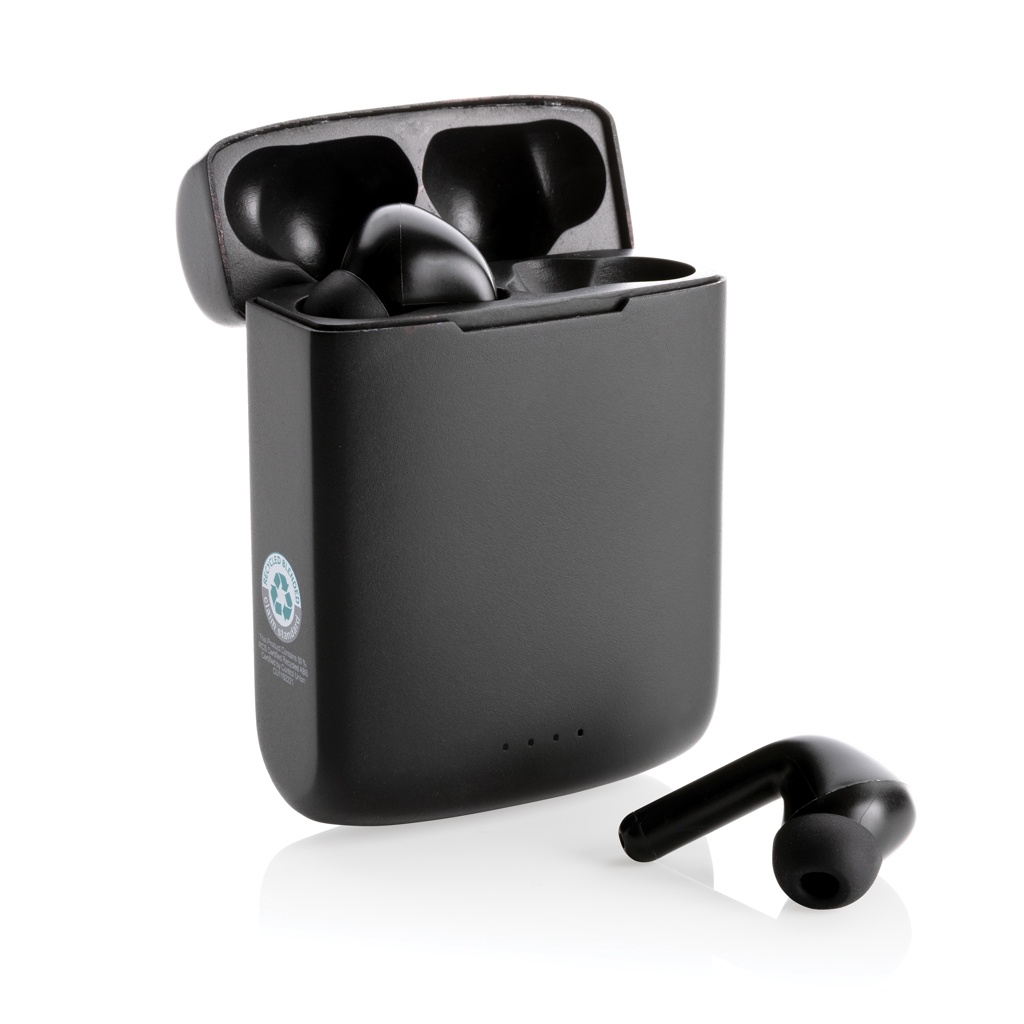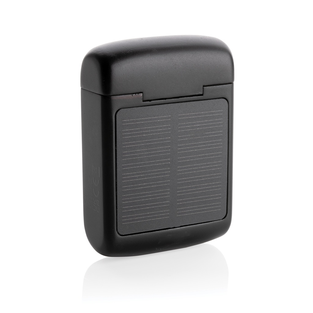Unikālas dubultā uzlādējamas bezvadu austiņas ar iebūvētu saules bateriju korpusā, kas izgatavotas no RCS sertificētas pārstrādātas ABS. Kopējais pārstrādātais saturs: 21% no kopējās preces svara. RCS sertifikācija nodrošina pilnībā sertificētu pārstrādāto materiālu piegādes ķēdi. Skaļrunis izmanto augstas kvalitātes monokristāliskos saules paneļus ar 19% konversijas likmi. Maksas likme ir atkarīga no apstākļiem. Saules uzlādes ātrums: 5V/50mA. Ideāli piemērotajām austiņām ir 35 mAh akumulators, un tās var atkārtoti uzlādēt 300 mAh uzlādes futrālī 2 stundu laikā. Ar automātiskās savienošanas pārī funkciju, kas ir tik vienkārši savienojama pārī ar mobilo ierīci. Atskaņošanas laiks vidējā skaļumā līdz 5 stundām. Ar BT 5.3 optimālam savienojumam. Darbības attālums līdz 10 metriem. Ar pacēlāju un mikrofonu. Ietver 3 izmēru silikona ausu uzgaļus un RCS sertificētu pārstrādātu TPE uzlādes kabeli. Iepakots FSC® mix kraft iepakojumā. Prece un aksesuāri 100% bez PVC.