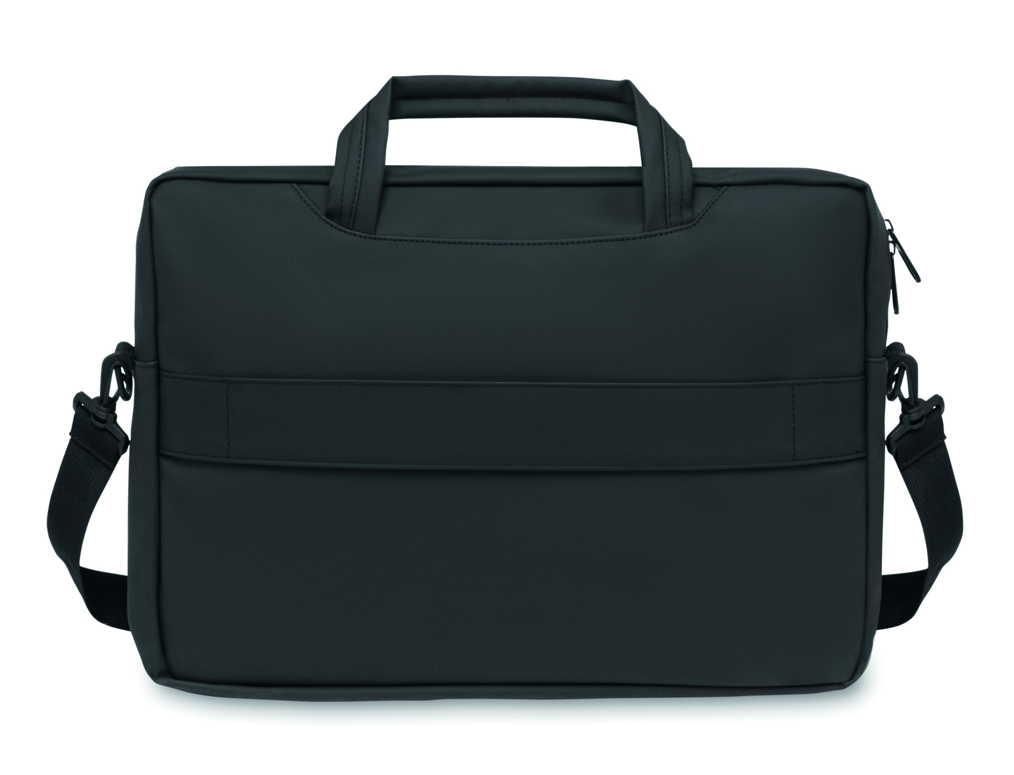 15 inch laptop document bag in soft PU with padded back . One main padded laptop compartment and zippered front pocket with several compartments. 210D RPET polyester lining. 2 handles and one adjustable and detachable shoulder strap with protection and trolley holder on back side.