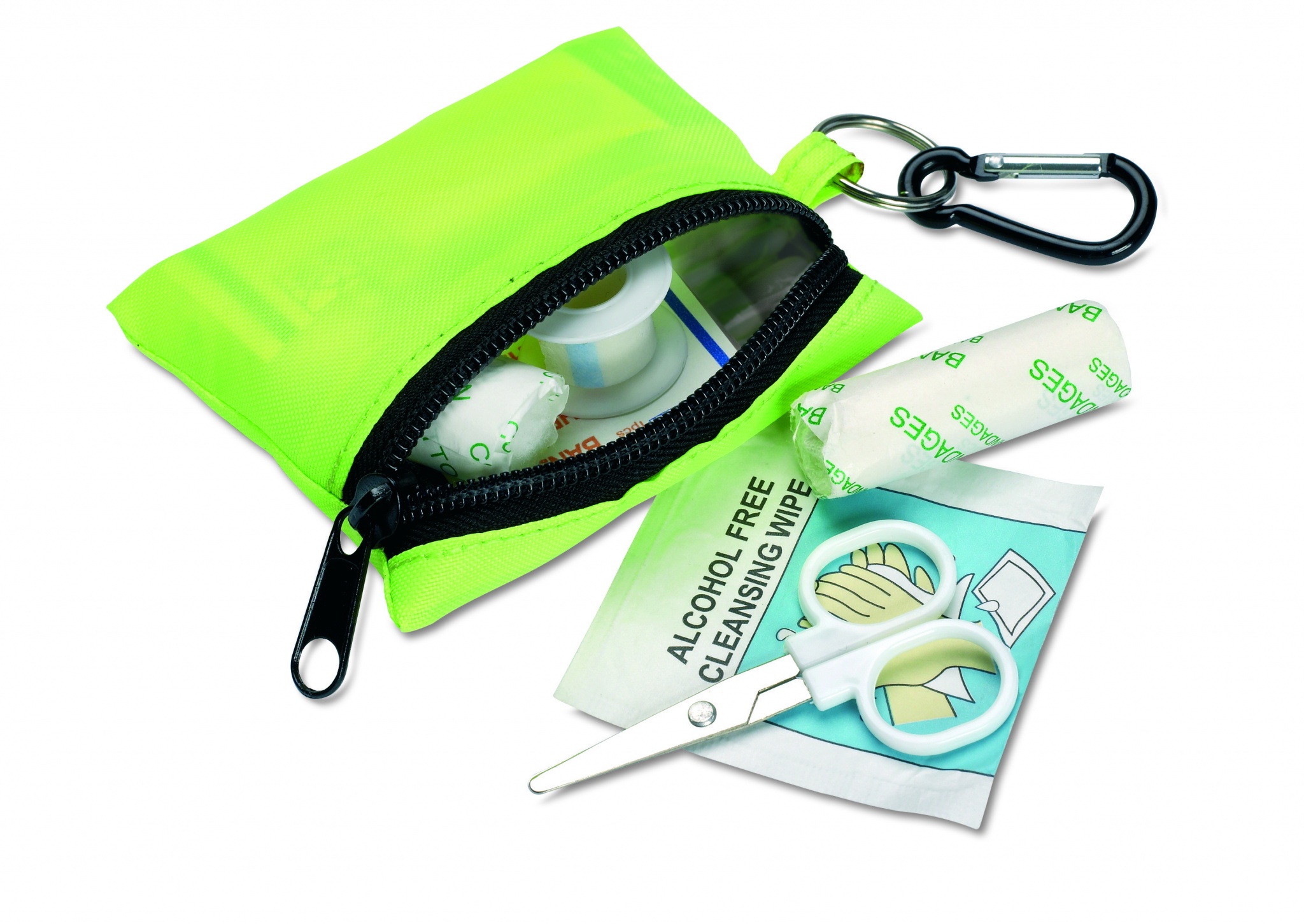 Аптечка для оказания первой помощи включает: ножницы, влажную салфетку, марлевый бинт, 3 ватных тампона и 5 пластырей. Упакована в чехол из полиэстера с молнией и карабином.
