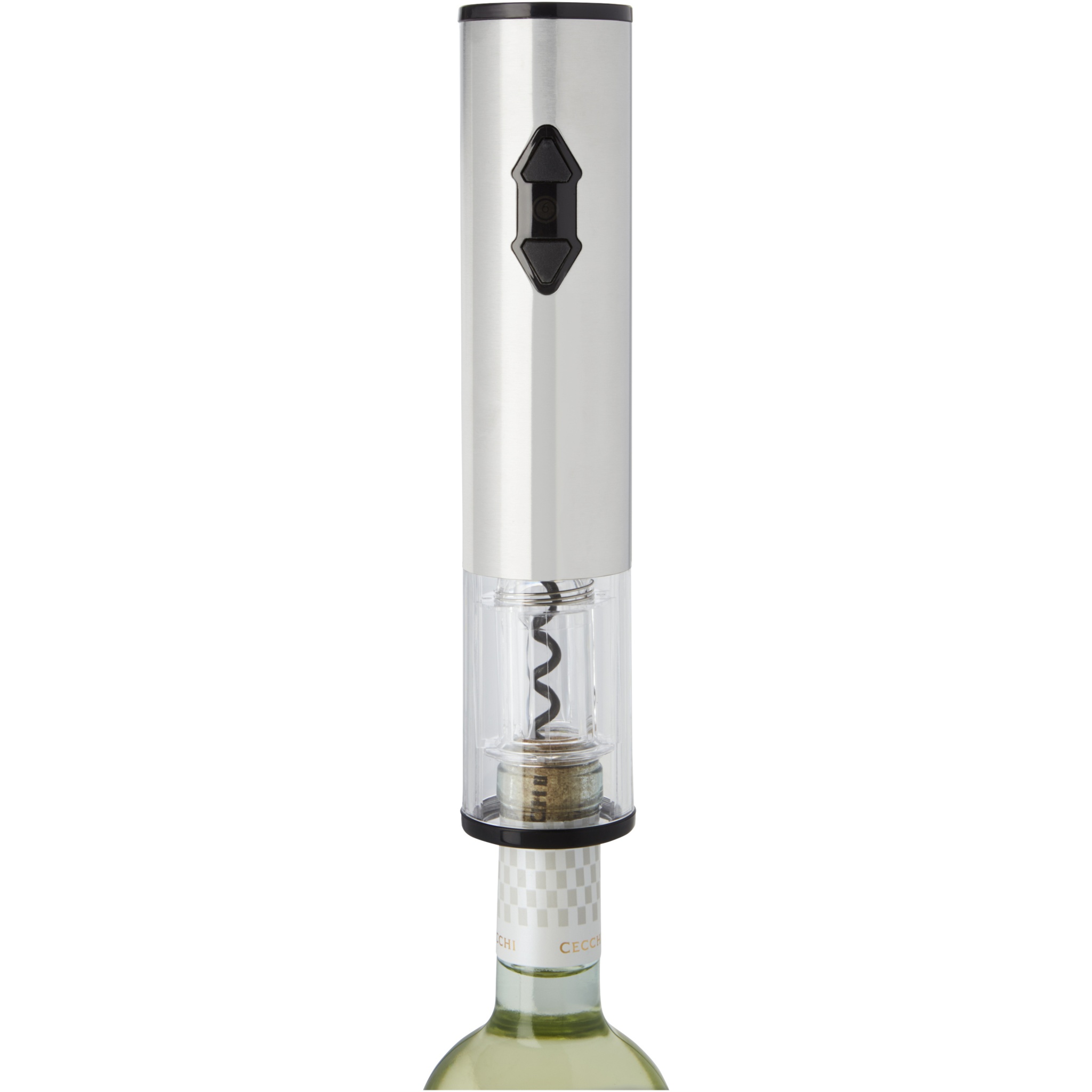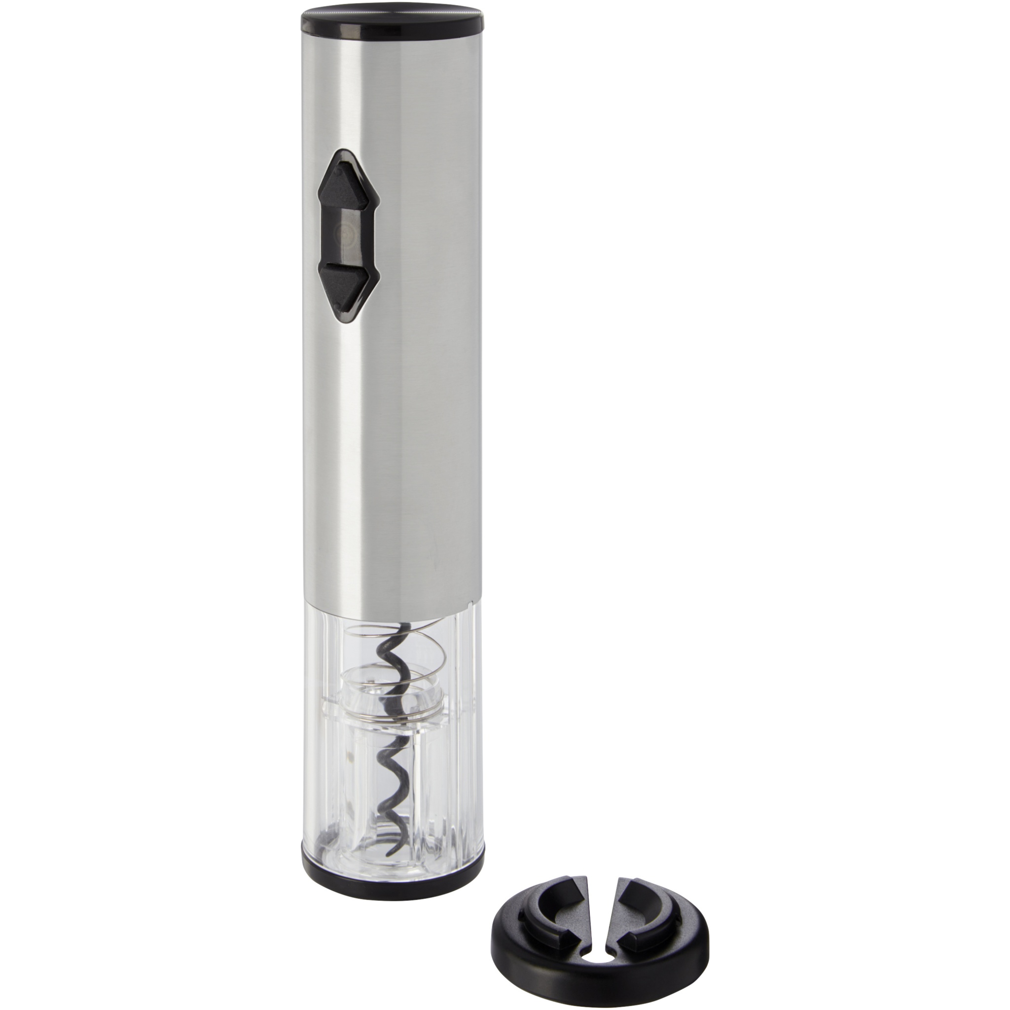 Электрический штопор, укомплектованный ножом для снятия фольги, насадкой на бутылку и пробкой. Работает от 4 батареек типа АА (не входят в комплект).