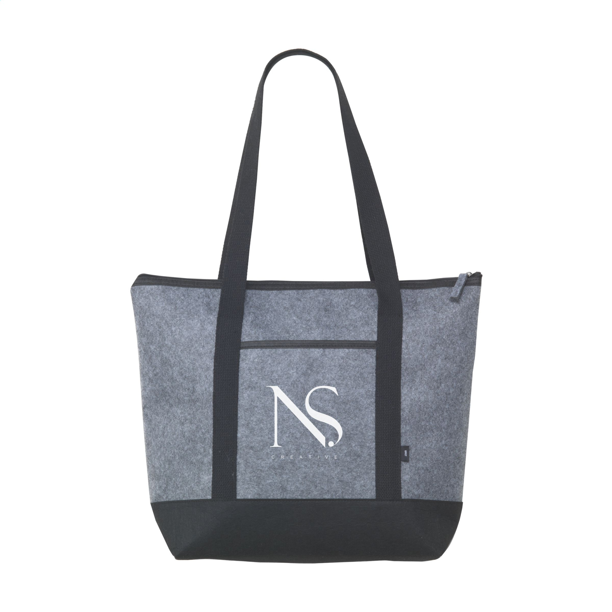 WoW! Вместительная сумка-холодильник из войлока RPET. Эта сумка имеет изолирующий алюминиевый интерьер, идеально подходит для транспортировки замороженных продуктов, а также для сохранения еды и напитков прохладными в течение дня. Классический дизайн с длинными ручками, молнией и накладным карманом спереди. Сертифицировано GRS. Общее количество переработанного материала: 55%. Вместимость около 20 литров.