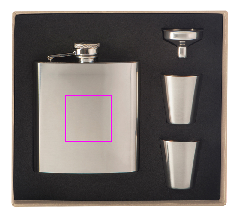 Красивый набор, состоящий из фляги (емкость 170 мл), двух стопок и воронки, изготовлен из нержавеющей стали. Ваш логотип будет нанесен лазером на флягу.