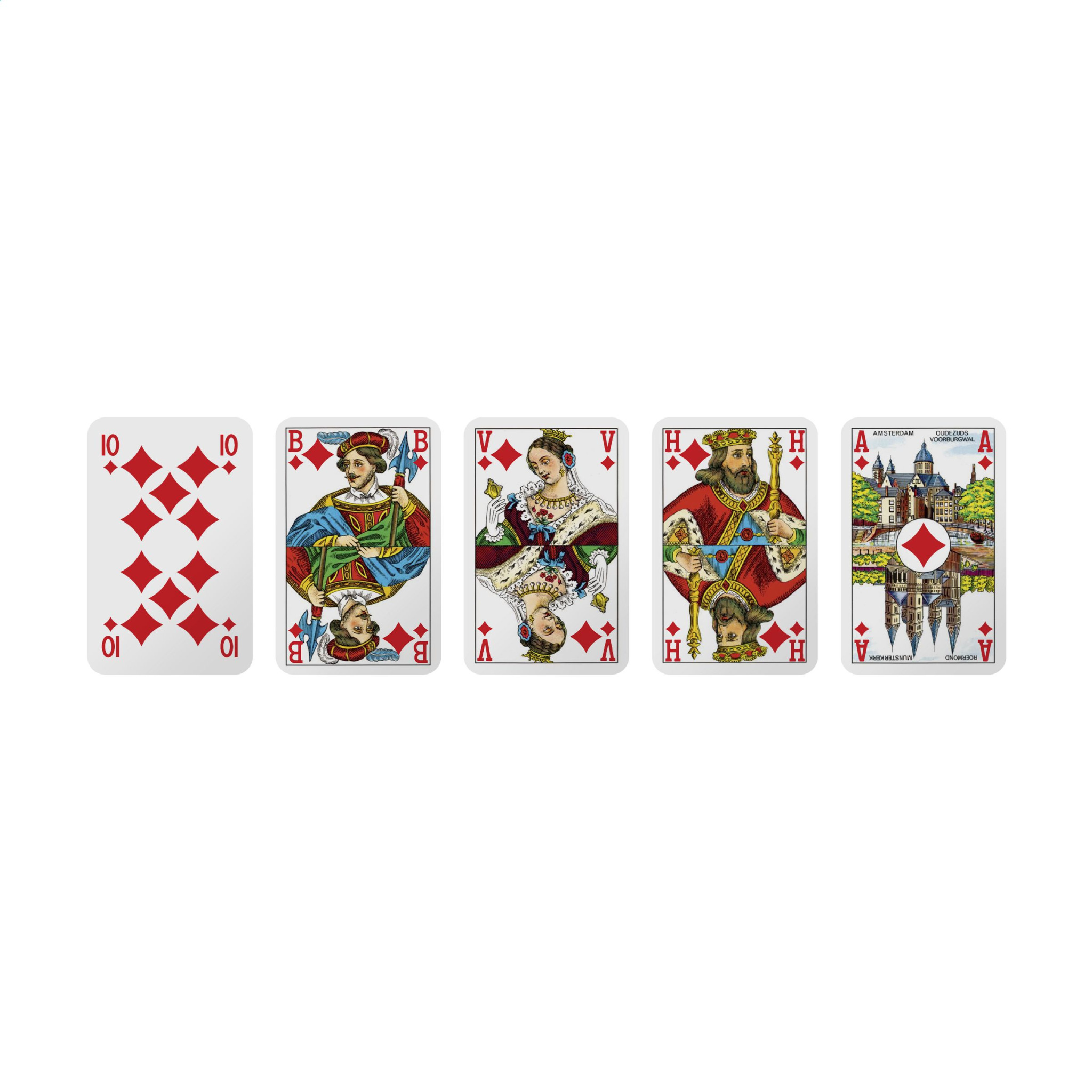 Игральные карты из прочного 300-граммового картона. С голландскими изображениями на лицевой стороне (A/H/V/B) и угловыми метками. Эти колоды состоят из 52 игральных карт и 2 джокеров. Упакованы в картонную коробку с целлофаном. Вы можете добавить свой полноцветный дизайн на оборотную сторону карт, а также на коробку, создав уникальную персонализированную колоду карт для продвижения вашего бренда с каждой игрой.