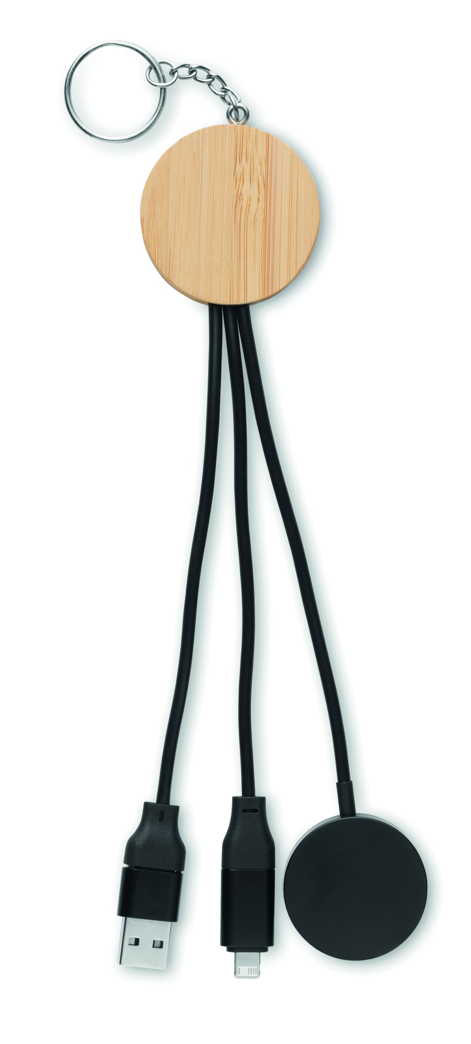 Key ring 4 in 1 charging cable 60W with bamboo detail. Input: 2-in-1 Type-C and Type-A. Output: Watch charging (Samsung® and Apple®), type-C and micro-B (2 in 1 pin).