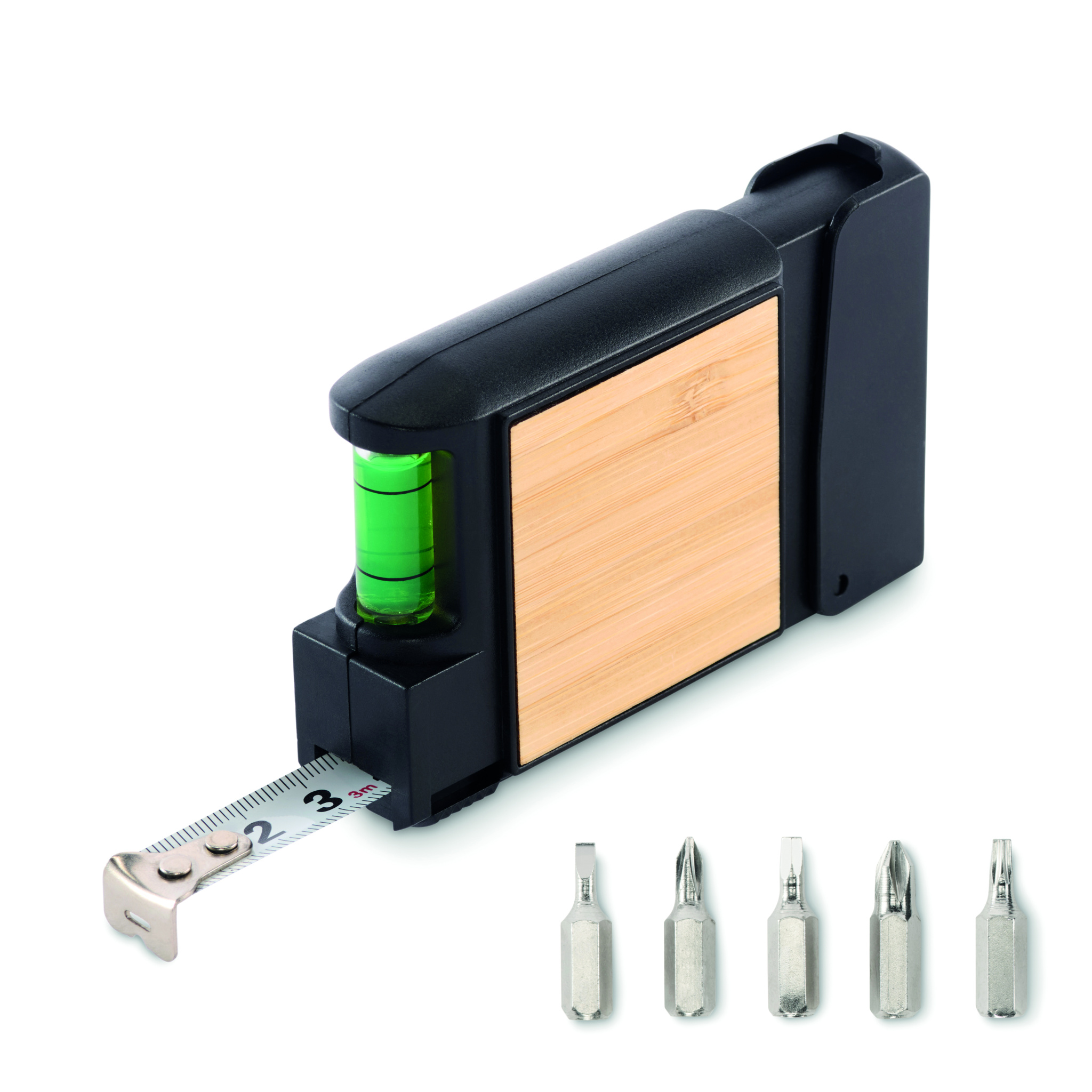 3M multifunctional measuring tape with bamboo detail, including spirit level and screwdrivers set with 5 bits.