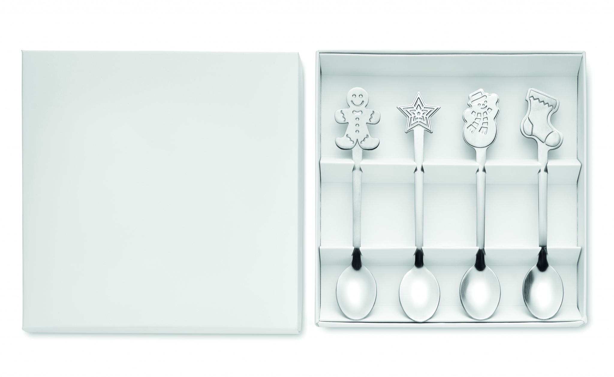 Набор из 4 чайных ложек из нержавеющей стали с рождественскими мотивами. Поставляется в подарочной коробке.