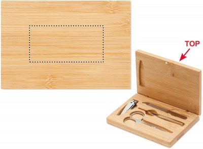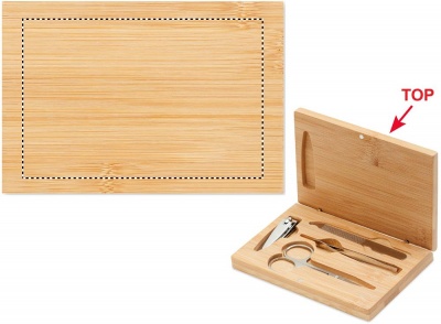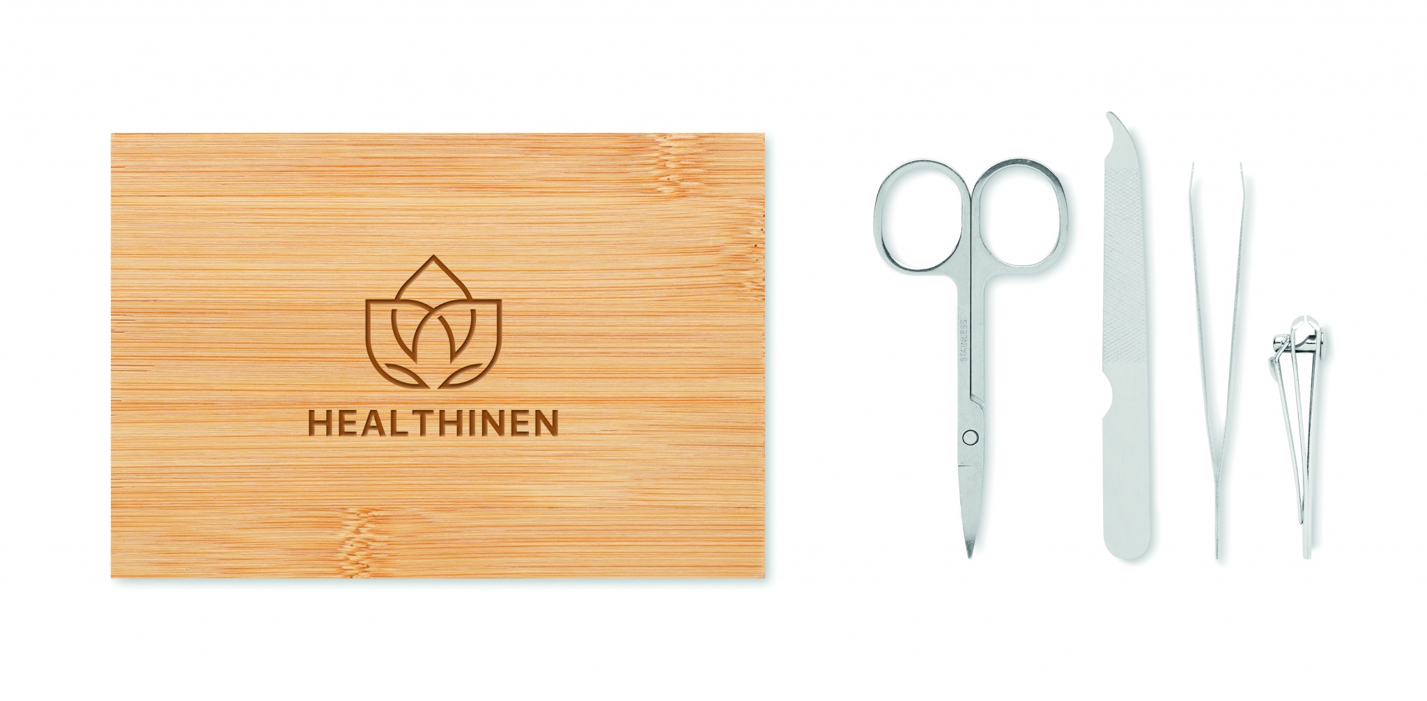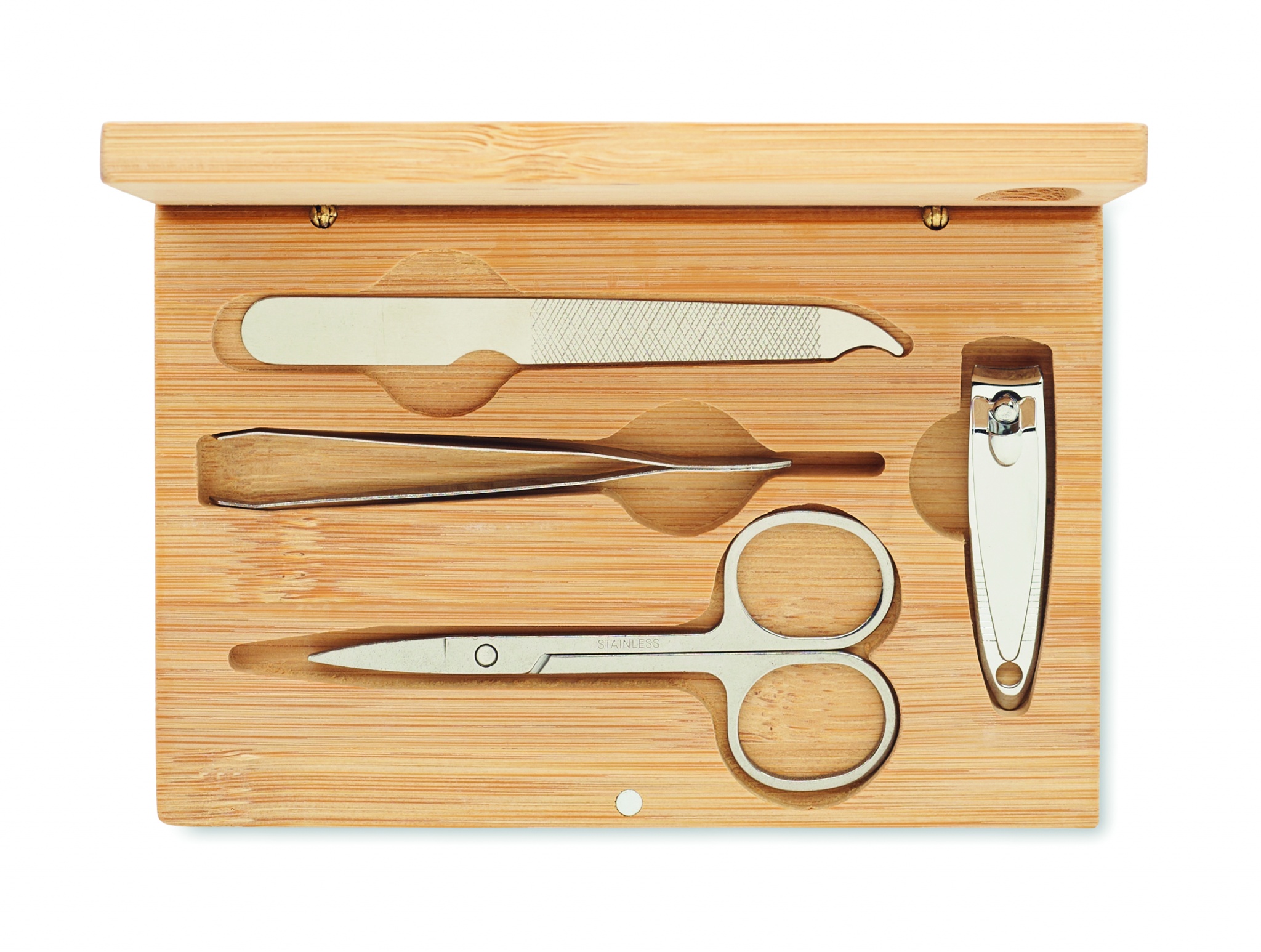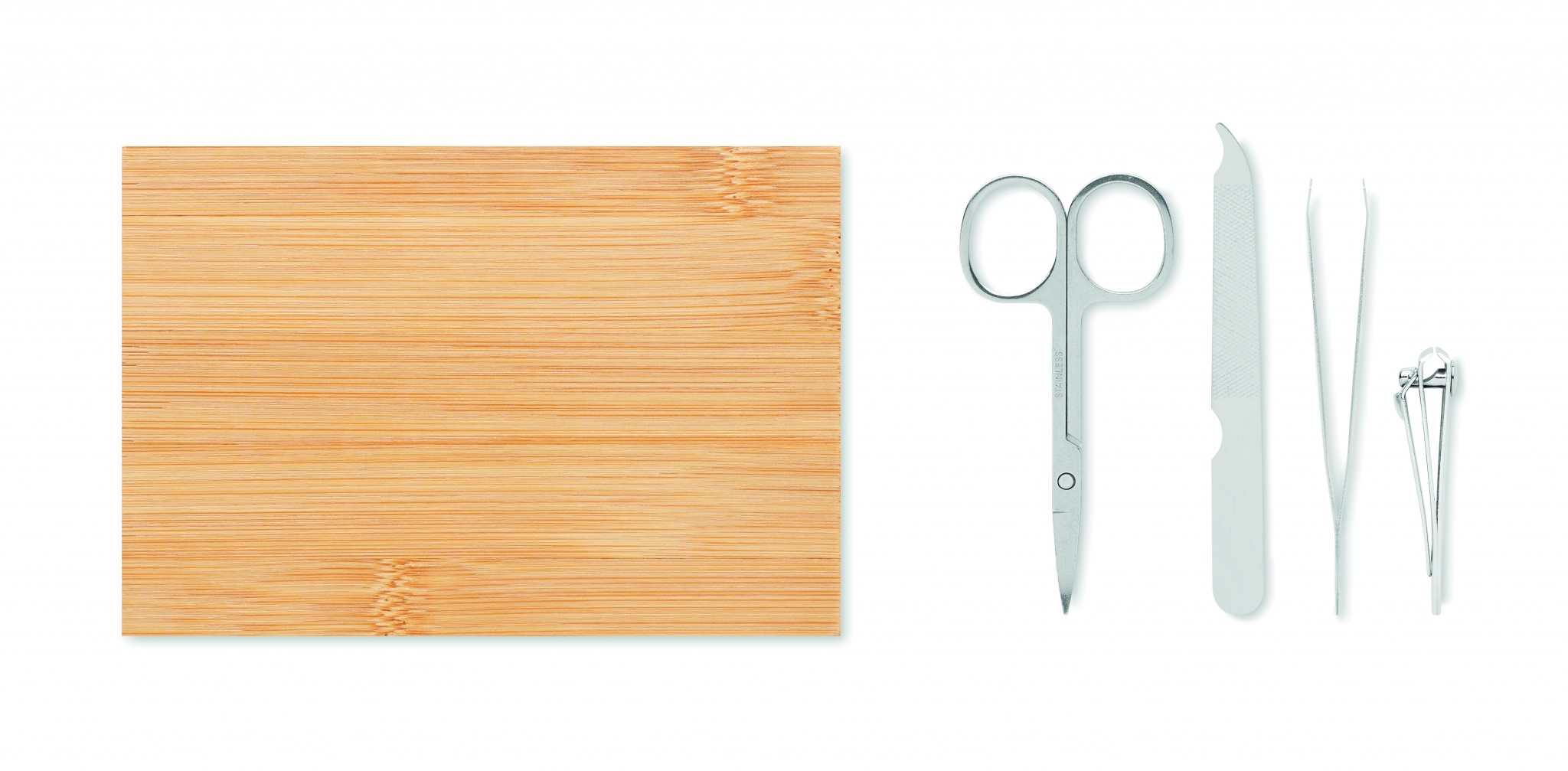 Маникюрный набор из 4 предметов из нержавеющей стали в бамбуковом футляре на магнитной застежке. В набор входят: изогнутые маникюрные ножницы, кусачки для ногтей, пилочка для ногтей и пинцет.