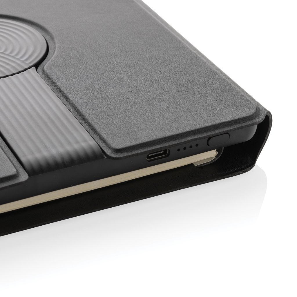 Заряжайте свой мобильный телефон и часы (только часы Apple) по беспроводной сети на полной скорости с этим блокнотом из полиуретана формата A5. Роскошное складное беспроводное зарядное устройство 2 в 1, изготовленное из переработанного полиуретана, сертифицированного RCS. Общее содержание переработанных материалов: 8% от общего веса изделия. Сертификация RCS гарантирует полностью сертифицированную цепочку поставок переработанных материалов. Прикрепите свой телефон (iPhone 12 или выше) к беспроводному зарядному устройству, и телефон идеально выровняется с магнитами внутри. Беспроводное зарядное устройство мощностью 10 Вт совместимо со всеми устройствами QI (iPhone 8 и выше, а также устройствами Android). Со встроенным аккумулятором класса A емкостью 5000 мАч внутри. В комплект блокнота входят 64 листа/128 страниц линованной бумаги FSC® плотностью 80 г/м².