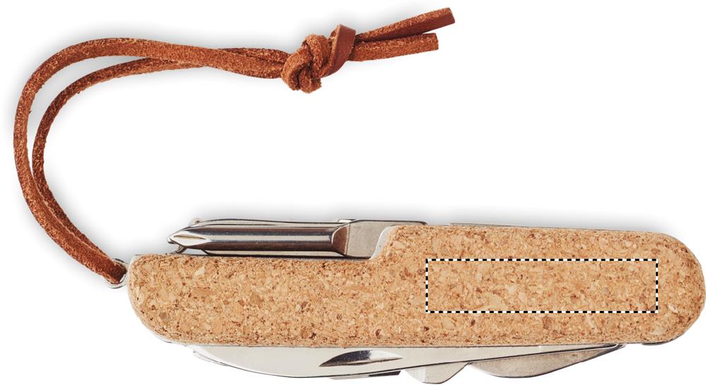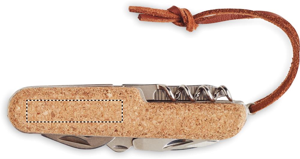 Многофункциональный карманный нож из нержавеющей стали с пробковым покрытием и полиуретановым шнурком. 7 функций. Включает 2 открывалки, нож, ножницы, отвертку с наконечниками Philips, напильник и открывалку для вина.