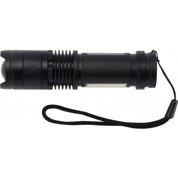 Перезаряжаемый пластиковый фонарик COB с двумя различными режимами света (обычный и мигающий), а также регулируемым фокусом и еще одной лампой на ручке. В комплекте кабель для зарядки (порт USB-USB-C).