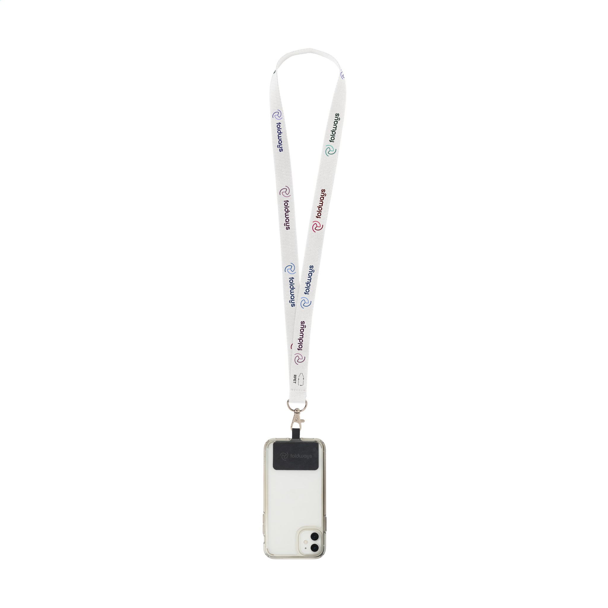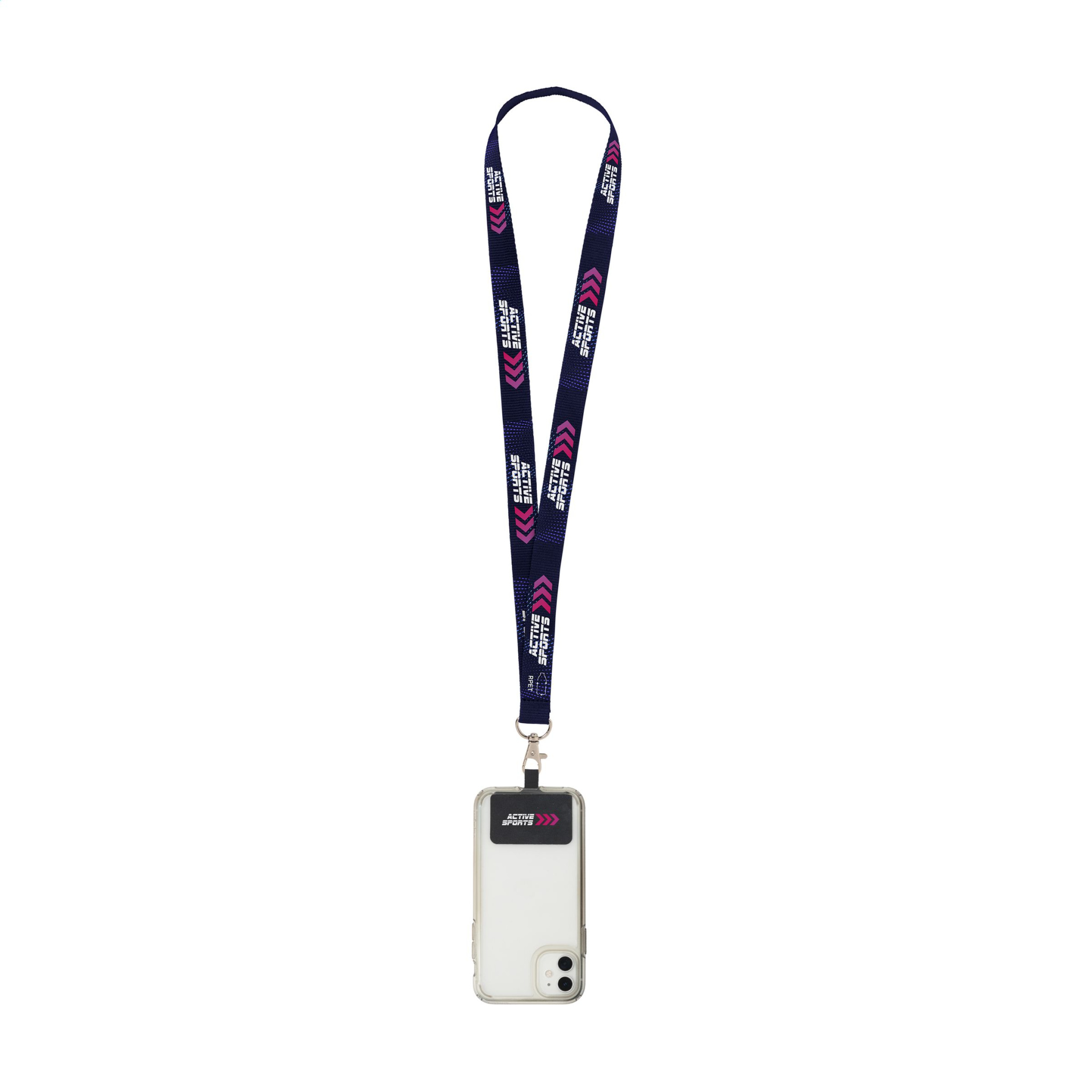Ремешок из прочного плетеного полиэстера RPET (из переработанных ПЭТ-бутылок). Поставляется с металлическим карабином и универсальной нашивкой. Нашивка позволяет прикрепить смартфон к ремешку. С помощью этой комбинации вы можете безопасно носить свой смартфон на шее. Это гарантирует, что ваш телефон будет быстро под рукой, а руки и карманы одежды будут свободны. Эта нашивка совместима с большинством комбинаций смартфона и чехла, но не с чехлами с открытым дном. Система разработана таким образом, что порт зарядки вашего телефона не блокируется, даже если он прикреплен к ремешку. Включая полноцветную сублимационную печать на ремешке. Сделано в Европе.