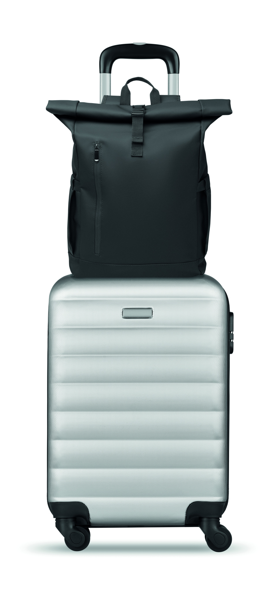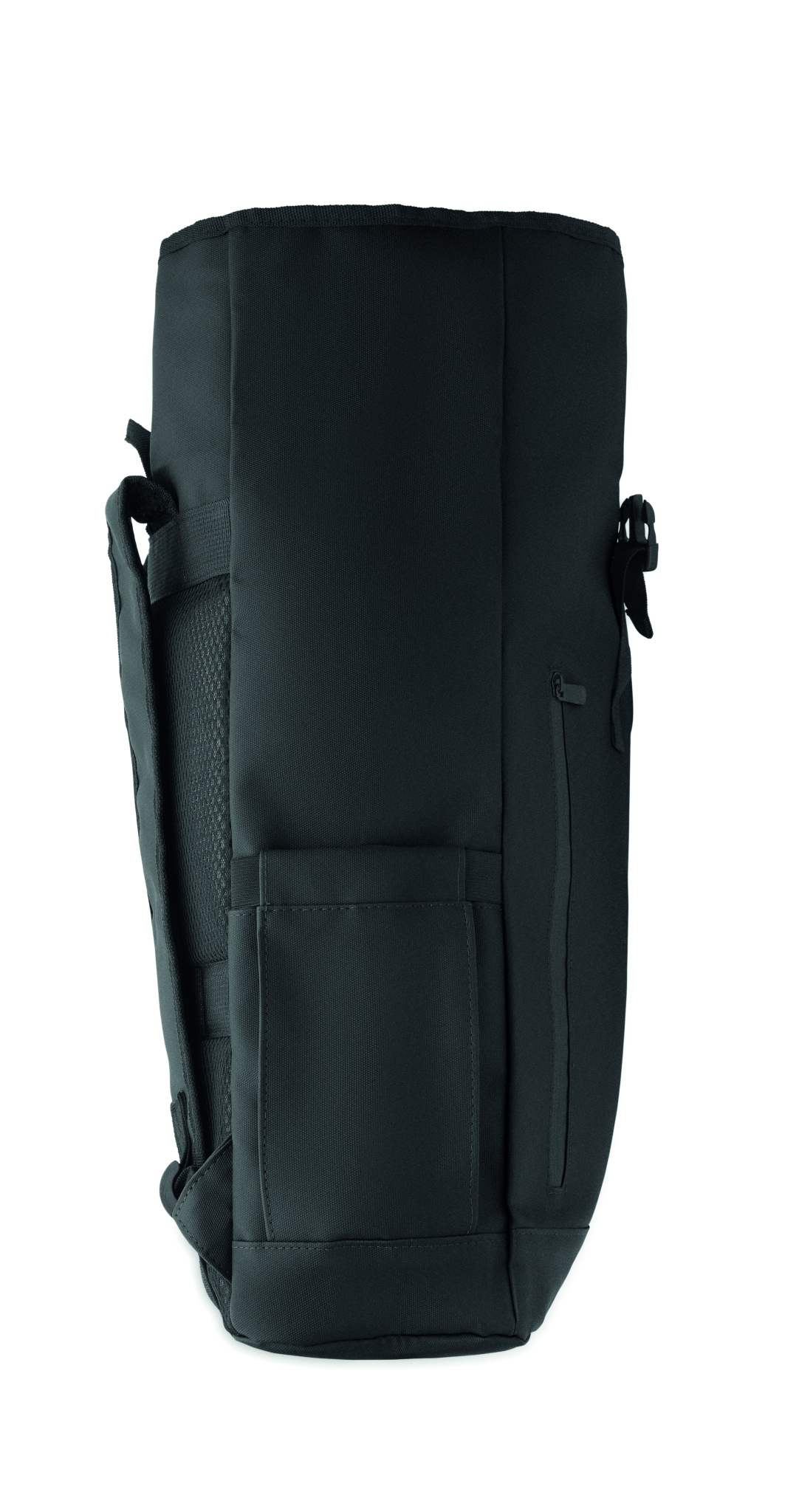 Roll top 15 inch laptop backpack in PU coated 600D RPET polyester and RPET polyester lining. Meshed padded back with zippered pocket and trolley strap. Padded shoulder strap with mesh inside finishing.
