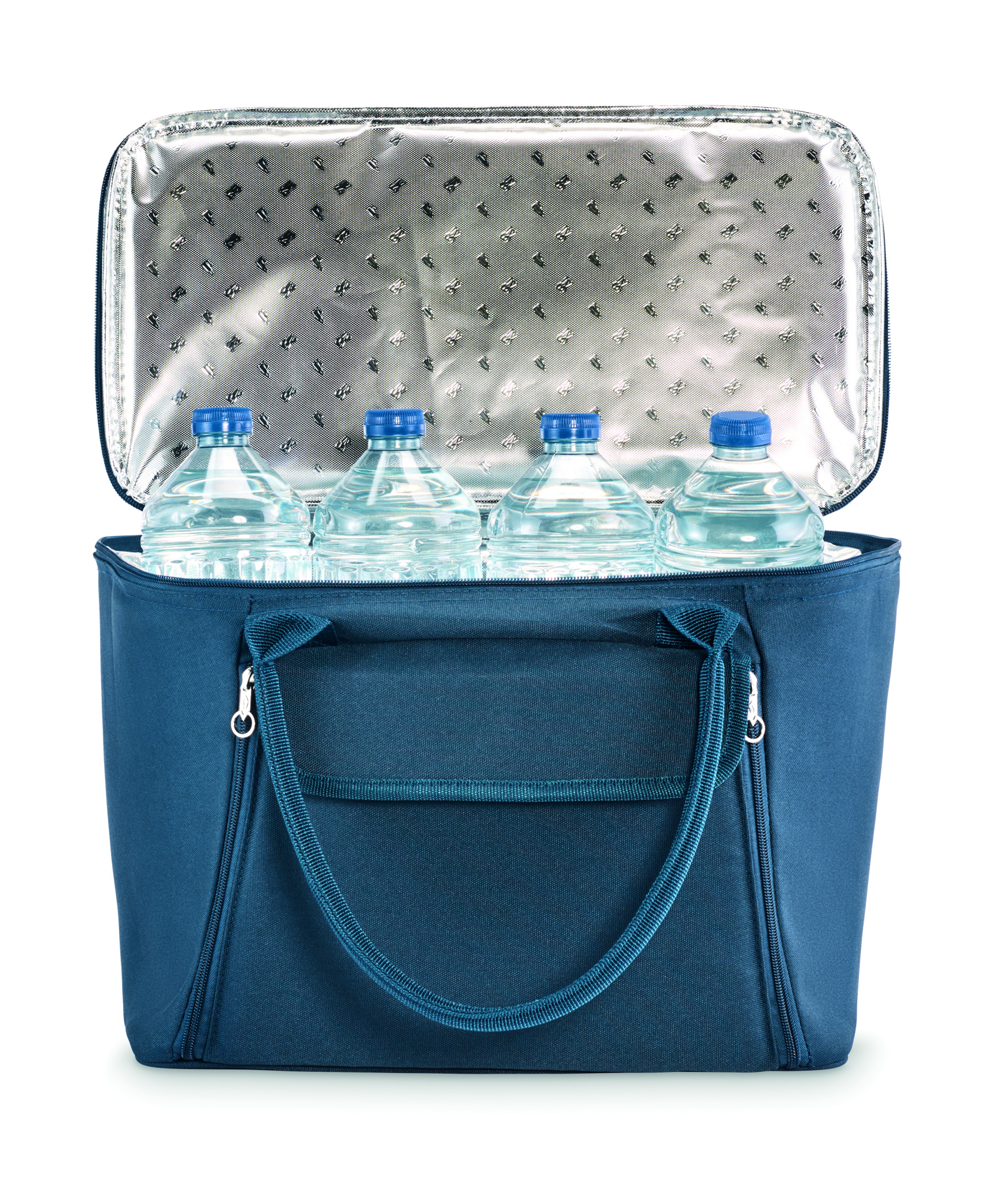 Picnic cooler bag in 600D RPET polyester for 2 people with zippered front pocket including stainless steel cutlery, 2 plates in PS, 2 glasses in PS and 2 cotton napkins. Capacity: 18l