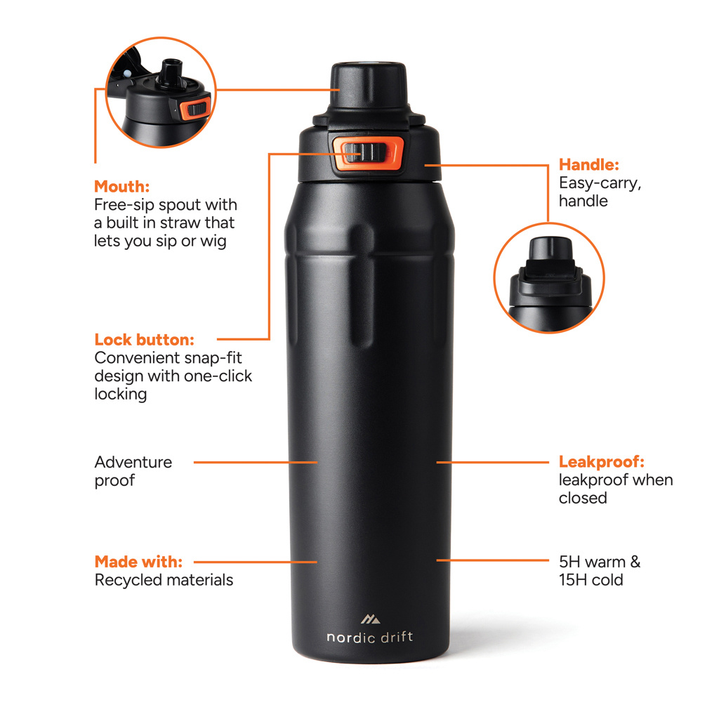 Создана для долговечности, для приключений. Представляем бутылку Nordic Drift из переработанной стали, изготовленную на 79% из сертифицированной RCS переработанной нержавеющей стали. Разработанная для приключений, она имеет объем 750 мл, прочный корпус с порошковым покрытием, ручку для переноски и запирающуюся крышку, обеспечивающую сохранность вашего напитка. Инновационная крышка предлагает два варианта питья: просто поверните ее от носика для удобного питья на ходу. Герметичная и созданная как для приключений на открытом воздухе, так и для повседневного использования, эта бутылка сочетает в себе практичность и экологичность. Поставляется в подарочной коробке FSC. Все продукты Nordic Drift проходят проверку качества. Поскольку мы твердо уверены в производительности и долговечности нашего снаряжения, на каждый товар предоставляется 5-летняя гарантия от производственных дефектов.