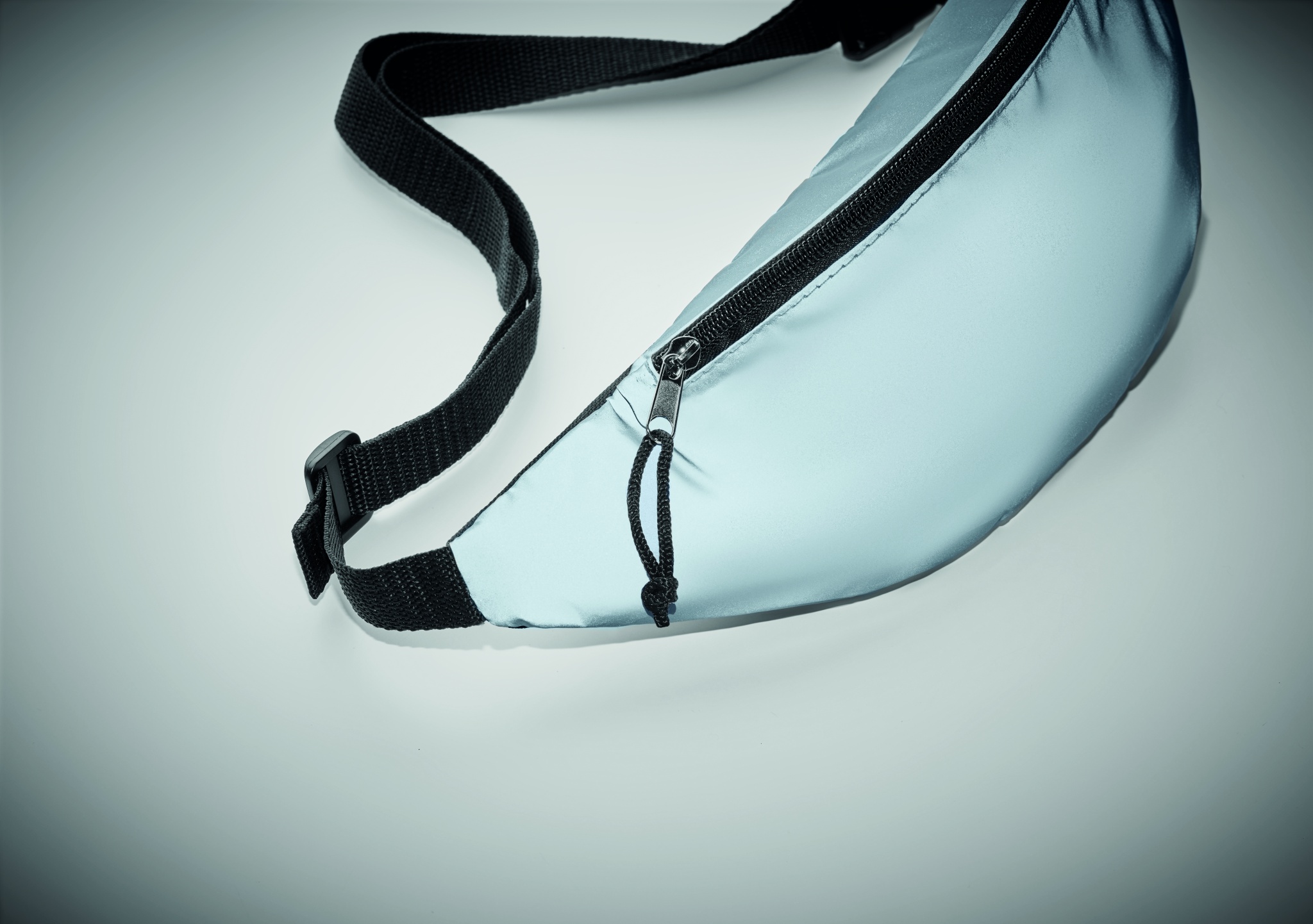 Поясная сумка с передней частью из высоко отражающего полиэстера, с регулируемым ремешком из полиэстера.