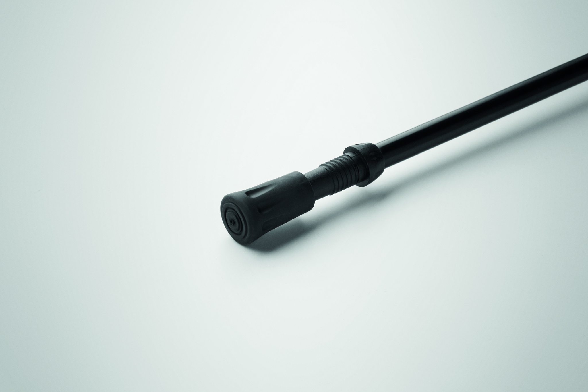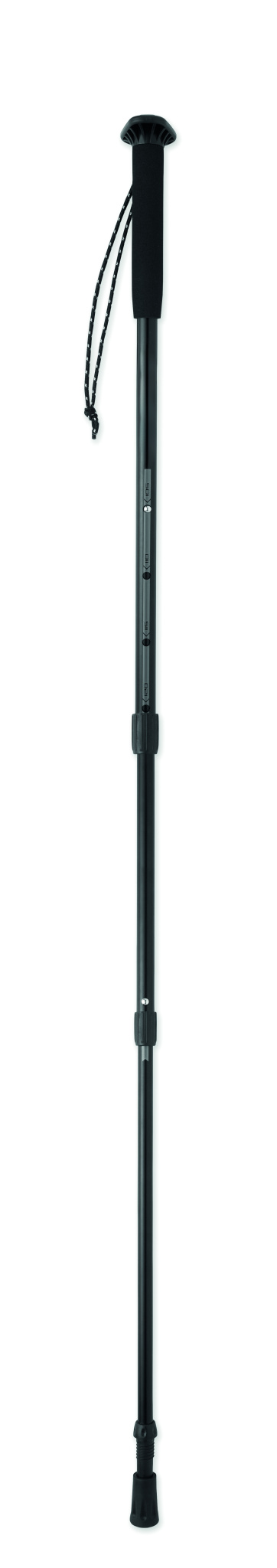 Telescopic walking pole with EVA handle, wrist strap, rubber tip, and mud basket. Adjustable from 105 to 120 cm. Packed in RPET drawstring pouch. Lightweight and durable design.