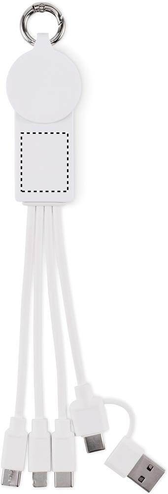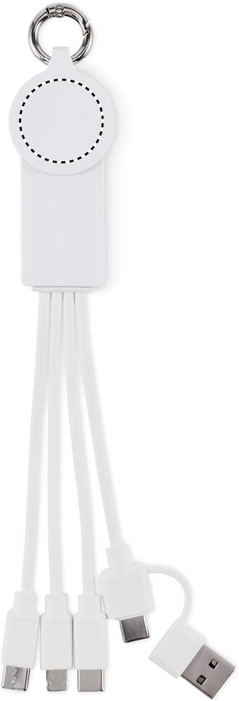 Nyckelring med laddningskabel med ingång: 2-i-1 typ-C & typ-A. Utgång: Laddning av klocka (Samsung® och Apple®), 2 x typ-C och micro-B (2 i 1 stift). Kabeln är tillverkad av återvunnen TPE.