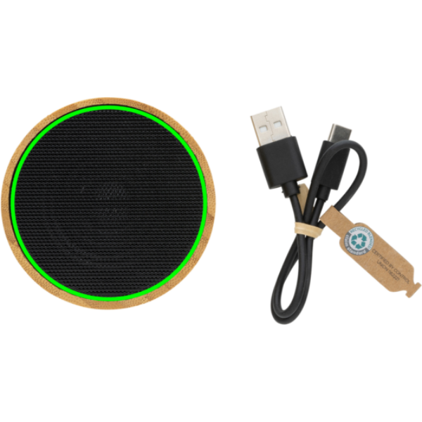 3W trådlös högtalare med FSC® 100% bambu hölje och (Recycled Claim Standard) certifierad återvunnen ABS. Totalt återvunnet innehåll: 16% baserat på total produktvikt. RCS certifiering säkerställer en helt certifierad leveranskedja av de återvunna materialen. Högtalaren har ett integrerat ljus i botten. Batteriet på 300 mAh ger en speltid på upp till 3 timmar och BT4.1 säkerställer en smidig anslutning, klart ljud och en räckvidd på upp till 10 meter. Med mikrofon för att besvara inkommande samtal. Laddningskabel i RCS certifierad TPE medföljer. Levereras i FSC mix FSC® kartong. Produkt och accessoarer är 100% PVC-fria.