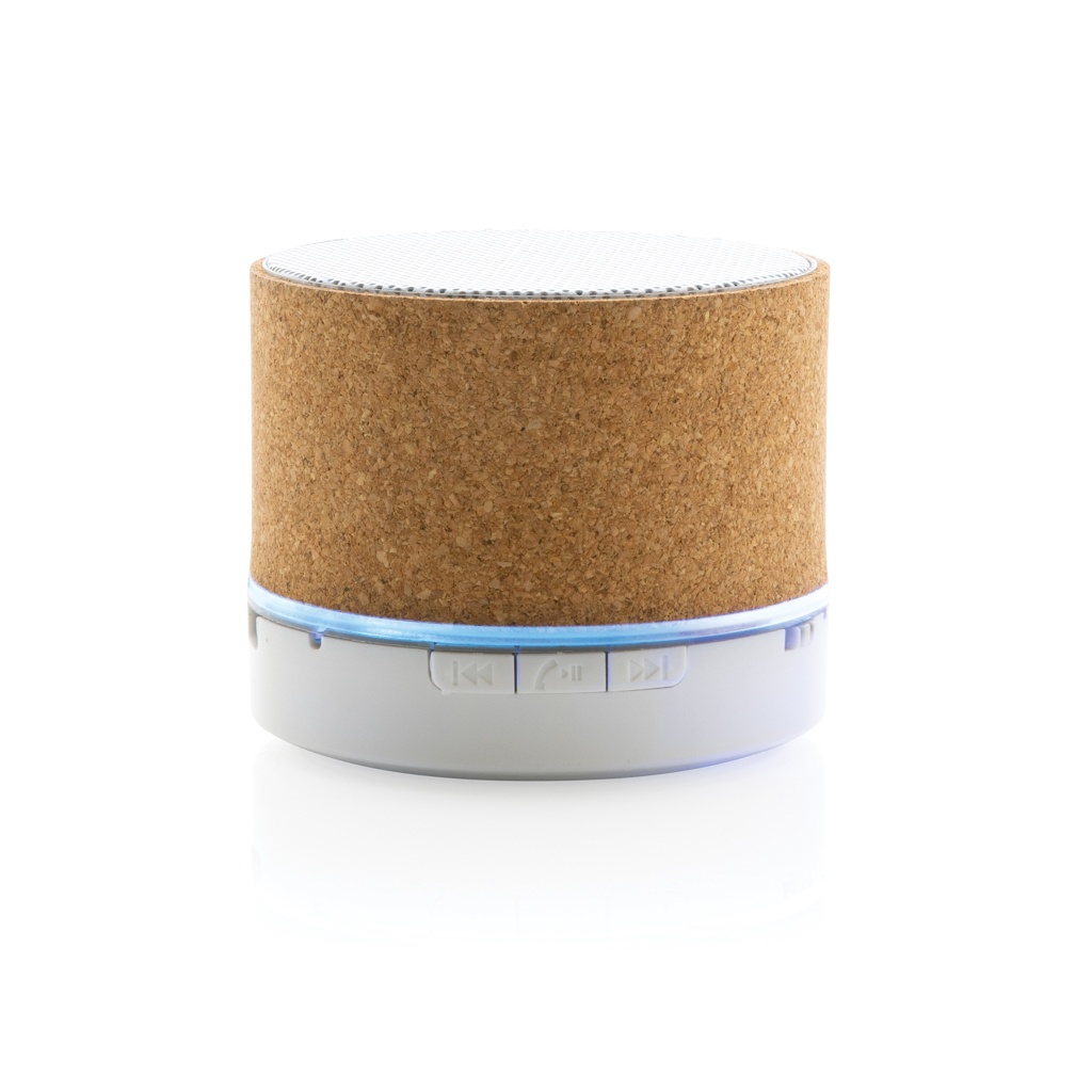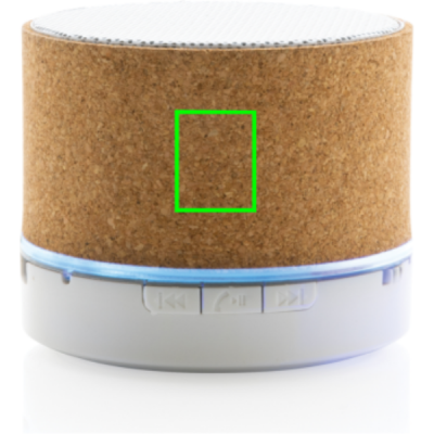 3W trådlös högtalare med hölje i FSC® 100% kork. Högtalarens batteri på 400 mAh ger en speltid på upp till 3 timmar. BT5.1 för smidig anslutning och klart ljud och en räckvidd upp till 10 meter.. Högtalaren har ett integrerat ljus när den är på. Med mikrofon för att besvara inkommande samtal. Levereras i FSC mix FSC® förpackning. Laddningskabel i RCS certifierad TPE medföljer. Produkt och accessoarer är 100% PVC-fria.