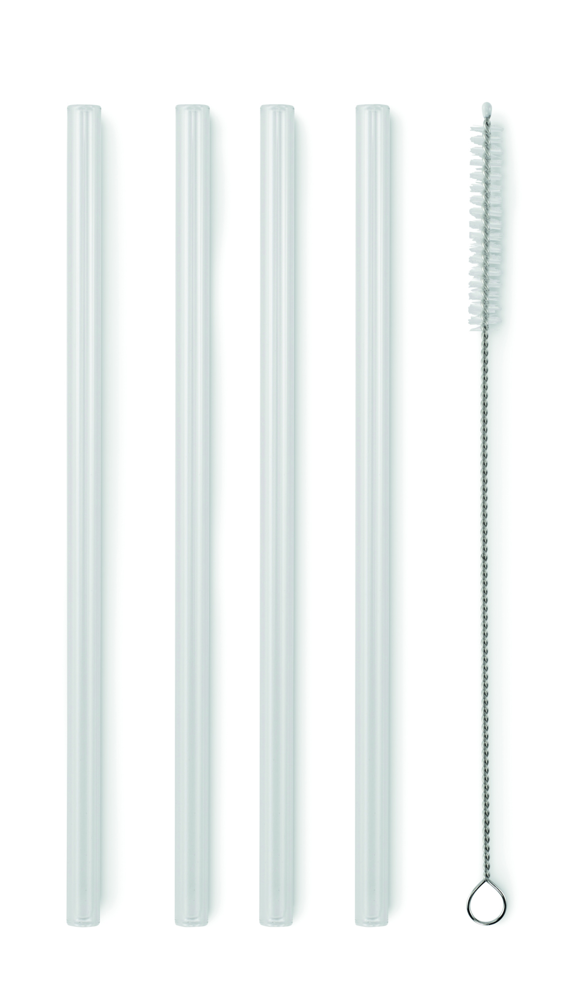 Förpackning med 4 återanvändbara sugrör i borosilikatglas med 1 rengöringsborste.