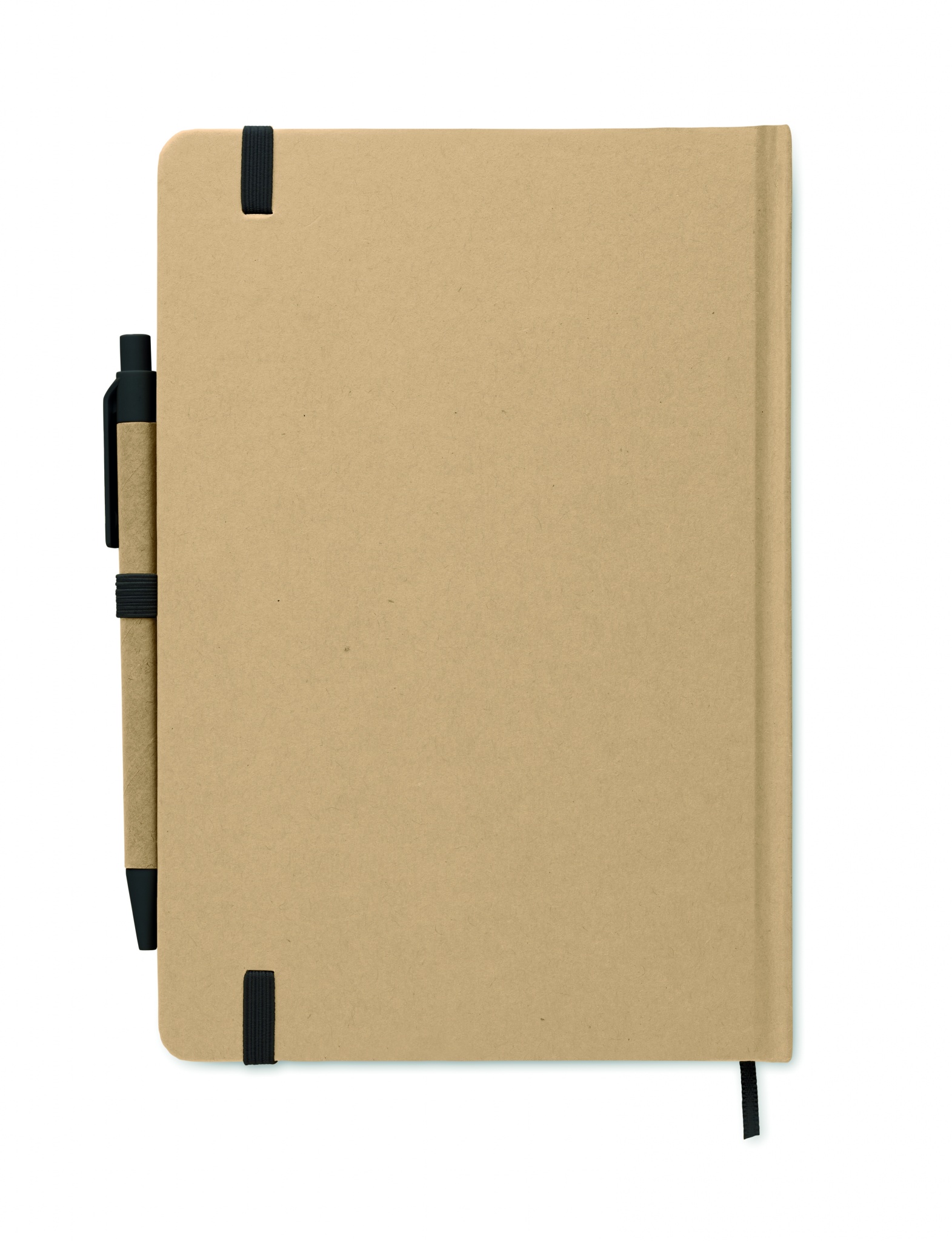 A5 anteckningsbok med omslag av hård återvunnen kartong. Inbunden med 160 linjerade sidor (80 ark återvunnet papper). Elastisk stängsningsband och pennhållare, sidomarkeringsband. Inklusive penna med kropp av återvunnet papper. Blått bläck