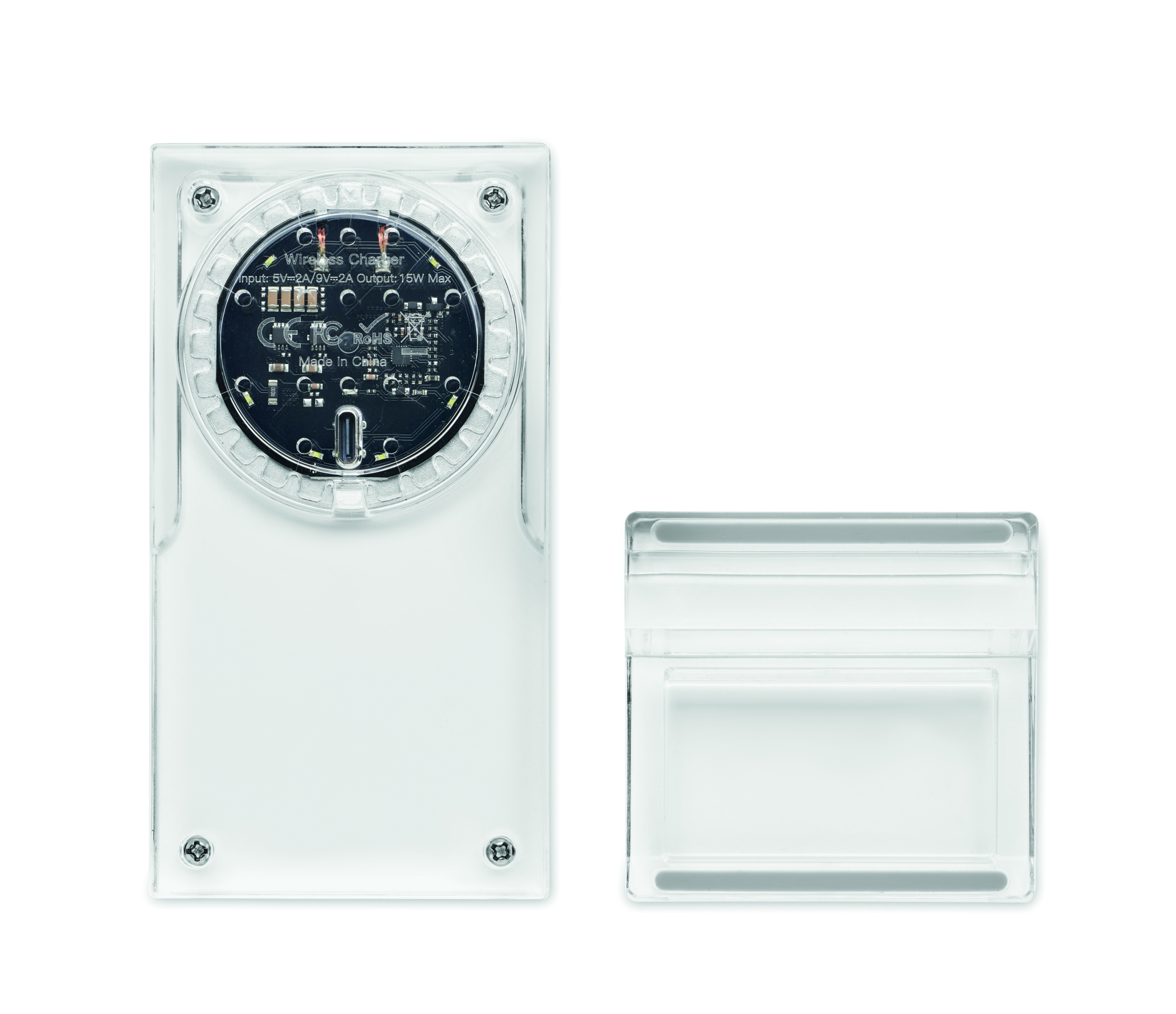 Trådlös laddare (15W) i akryl med telefonställ. När den är ansluten till en strömkälla laddar den din mobila enhet trådlöst. Utgångseffekt: 9V/1,67A (15W) för snabbladdning.